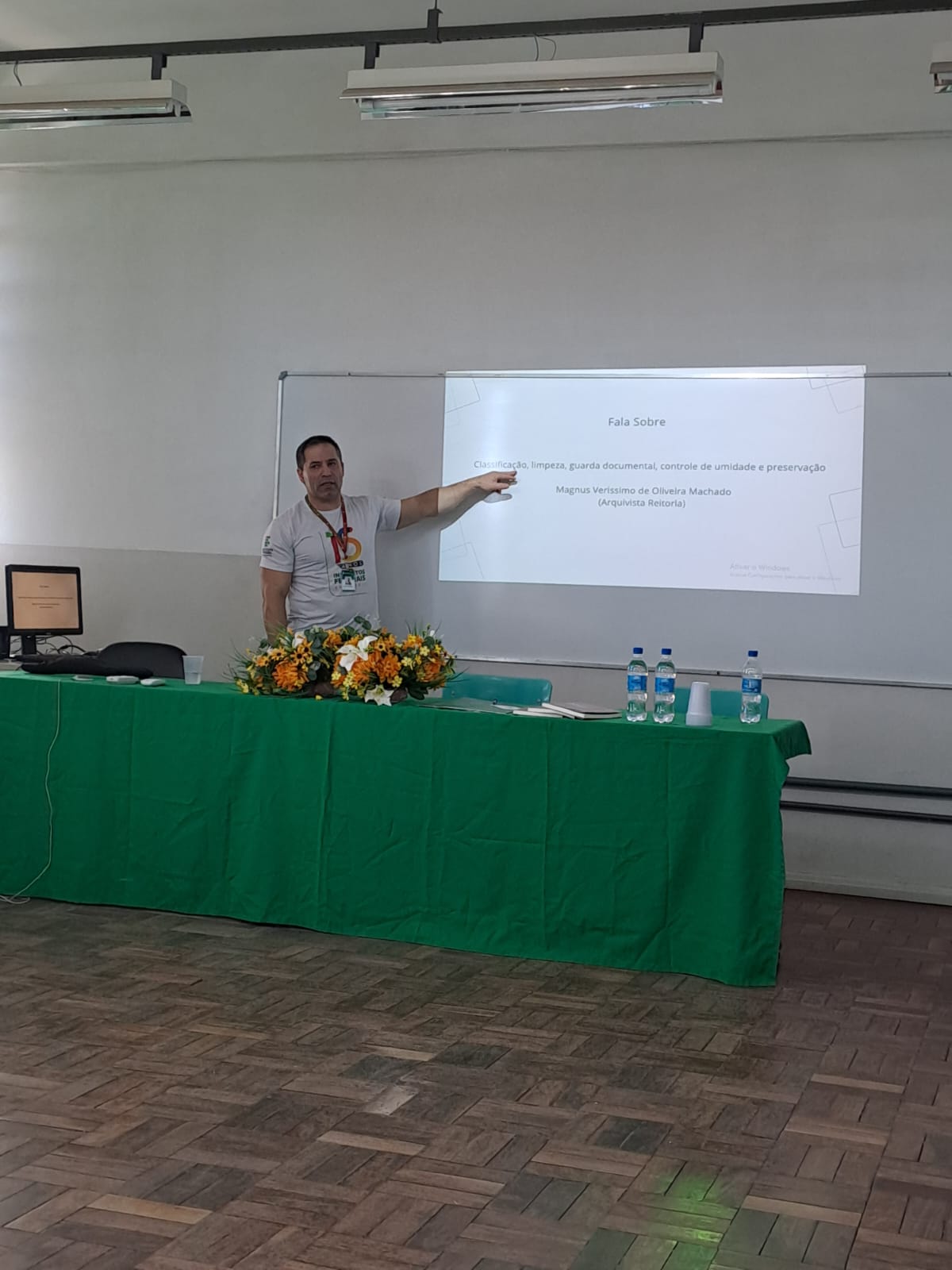 Aconteceu entre os dias 4 e 6 de agosto, no Campus Uruguaiana, o VII Fórum das Bibliotecas e Arquivos do IFFar. O evento que acontece anualmente reuniu os Bibliotecários, os Auxiliares de bibliotecas e Arquivistas. O objetivo do evento é compartilhar saberes e vivências de cada biblioteca, além de discutir questões pertinentes a Gestão das unidades. Este ano foi a vez de Uruguaiana sediar o evento e foi importante conhecer a rotina de trabalho das bibliotecas da cidade que também fazem parte da rede Pergamum. Destacaram-se no Fórum a biblioteca da Escola Marista Santana, na qual a Bibliotecária Leonise Loose e as Assistentes de biblioteca Helena Martins e a Luciana Guimarães apresentaram o sistema Pergamum e as atividades de incentivo a leitura que realizam; A formação com a CAPNE, ministrada pela Coordenadora Sandra Machado; E a palestra sobre Bibliotecas Universitárias e inteligência artificial na pesquisa acadêmica, explanada pela Bibliotecária do Colégio Pedro II, Cristiane Almeida Rodrigues. Além das apresentações de trabalhos dos servidores: O Arquivista Magnus Machado, apresentou o trabalho que desenvolve relacionado a classificação, limpeza, guarda documental, controle de umidade e preservação; nesse seguimento, o Bibliotecário Frederico Cutty apresentou seu Projeto de incentivo a leitura; O Bibliotecário Josef Aquino apresentou o trabalho sobre biblioteca digital; A Auxiliar de biblioteca, Lurdes Mauí apresentou o produto de sua dissertação, intitulado as contribuições da biblioteca como guardiã da memória e do acervo; A Bibliotecária Daniela D’Campora e as Auxiliares de biblioteca Liliam Paranhos e Isabela Lima apresentaram o projeto Biblioteca em Ação. E, por fim, aconteceu a apresentação da Pesquisa realizada no Arquivo Municipal de Uruguaiana, pelo Professor e estudante de Arquivologia Tiago Lucho Rangel. O evento foi finalizado com a visita técnica e apresentação das rotinas de trabalho na biblioteca da Unipampa Campus Uruguaiana, ministrada pelos Bibliotecários Marcos Anselmo e Fernanda Rocha. O VII Fórum foi organizado pelas Bibliotecárias Kauana Rodrigues Amaral e Cristiane Silva Teixeira, com a colaboração dos servidores Crislaine de Paula Espindola, Natthan Ruschel e Maria Rita Rosa da Silva. Agradecemos aos estudantes Maria Eduarda Martines e Verlei Tedy pela apresentação artística e também agradecemos as Bibliotecárias Michele Fernanda Silveira e Carmem Elisa Magalhães que atuaram como mediadoras durante o VII Fórum das Bibliotecas e Arquivos.
