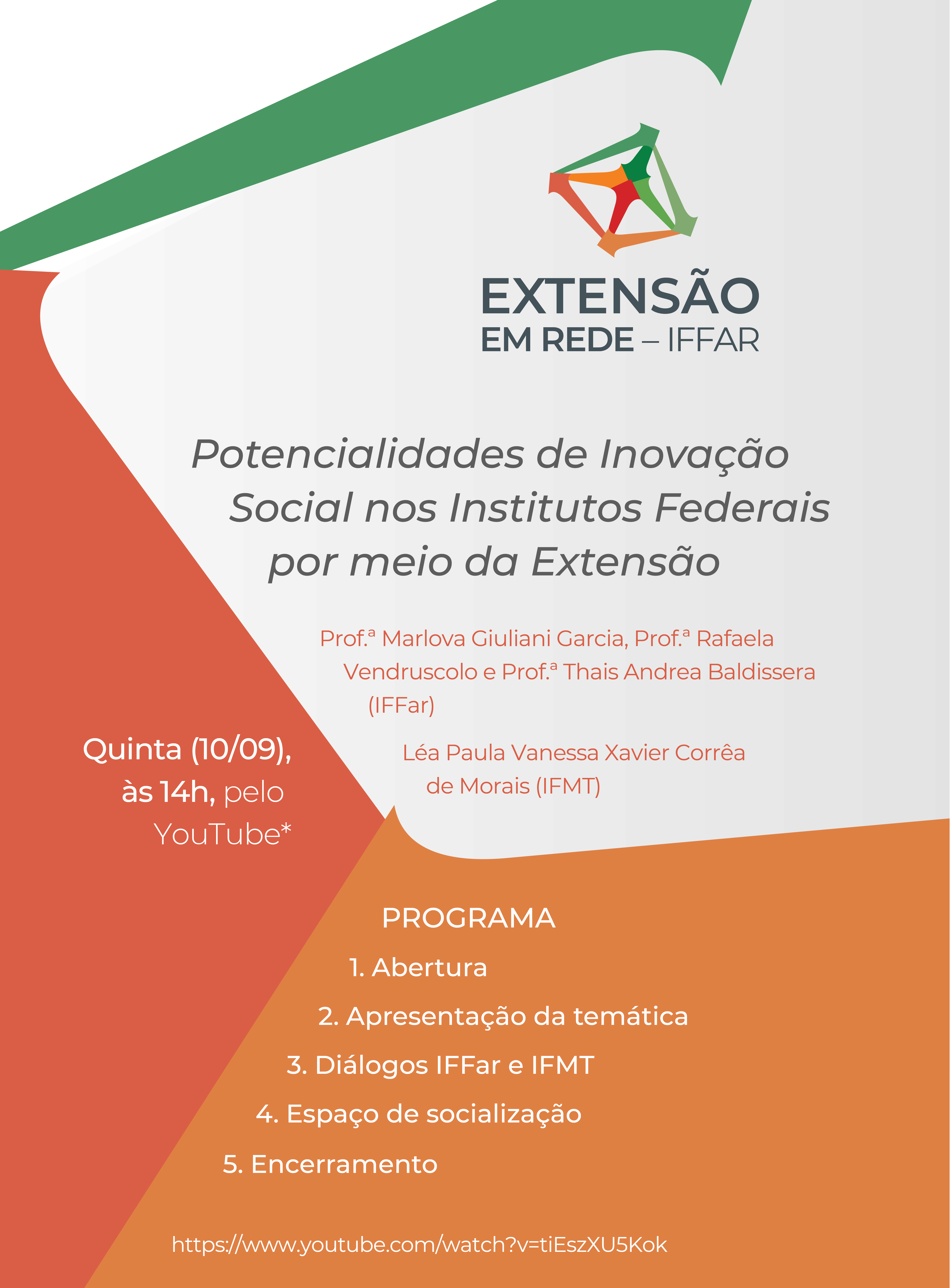 Nesta quinta (10), às 14h, o IFFar promove mais uma live da série "Extensão em Rede". O debate terá como tema "Potencialidades de Inovação Social nos Institutos Federais por meio da Extensão". Acompanhe por meio deste link do YouTube.