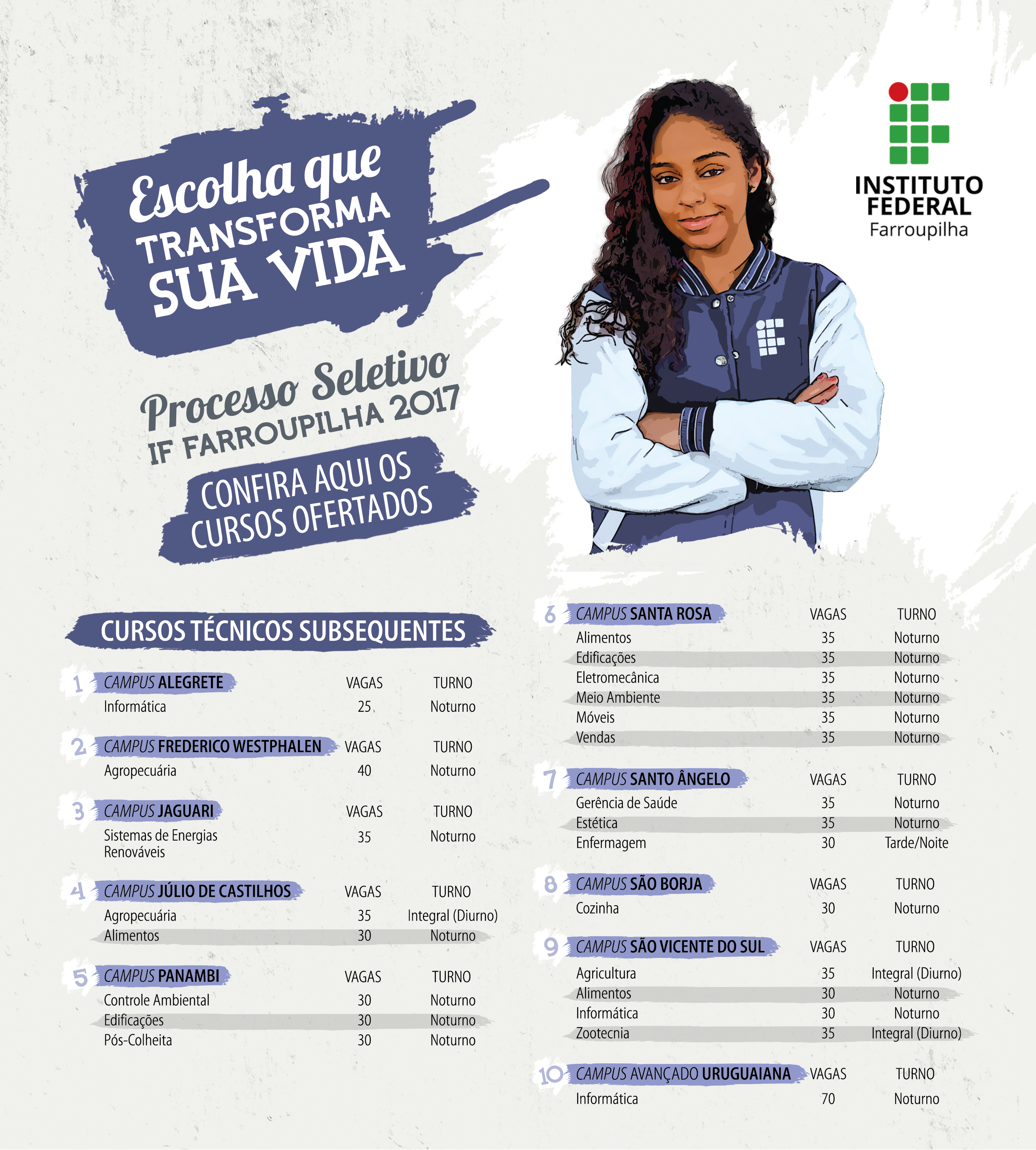 As inscrições para o Processo Seletivo 2017 para cursos técnicos subsequentes do IFFar, assim como os cursos, são 100% gratuitas. São oferecidas mais de 795 vagas em 10 municípios. O cursos têm início no primeiro semestre de 2017.