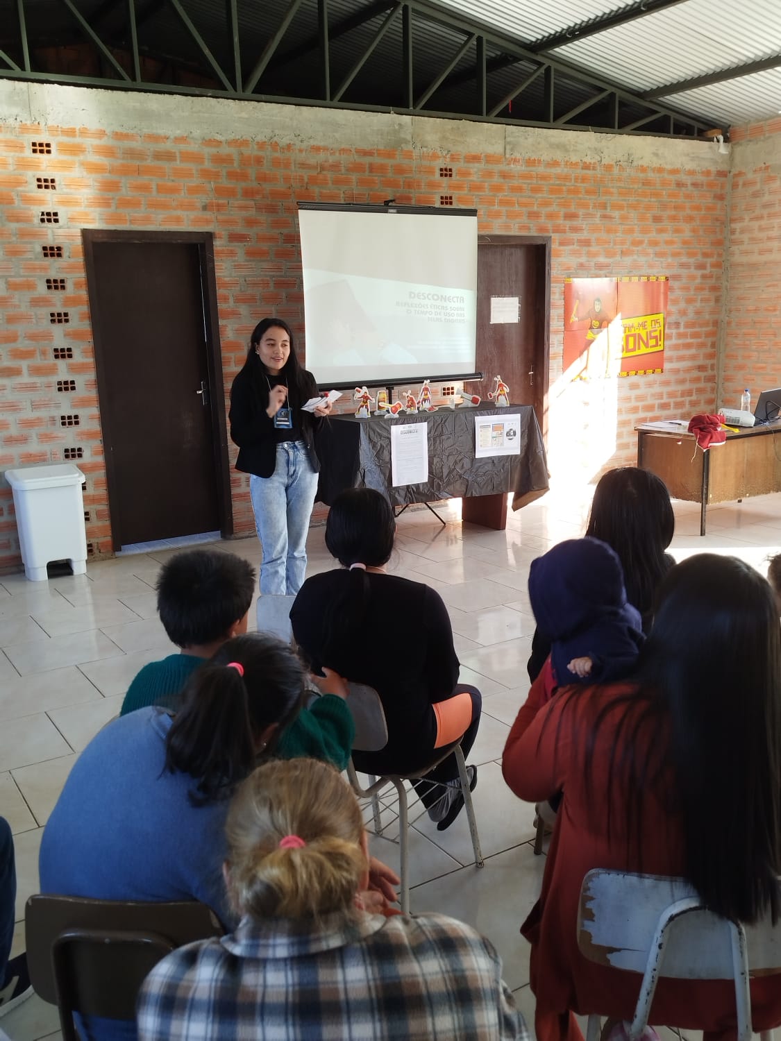 A estudante Gabriele Cargnin Mazzaro reforçou que a oficina proporcionou não só reflexão, mas também a vivência prática dos conteúdos estudados: “A conversa foi aberta, com trocas de experiências e reflexões sobre o impacto do uso das tecnologias digitais no nosso bem-estar. Por meio de atividades como desenhos com as crianças e uma encenação educativa sobre o Chapolin, percebemos a interação e o divertimento do público. Foi um momento importante de conscientização para todos, adultos e crianças, sobre o equilíbrio entre o mundo digital e o real”.