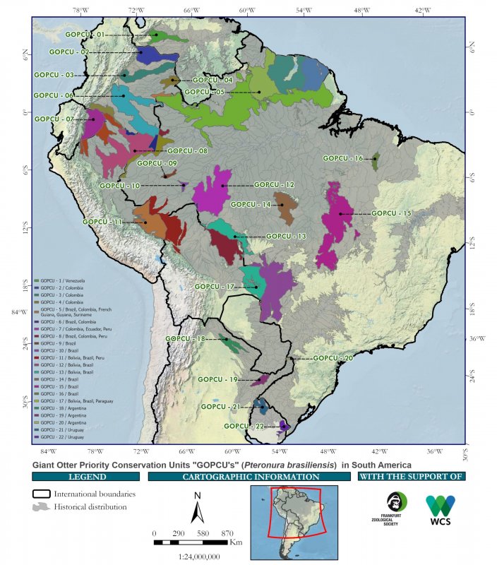 Mapa Estratégico para conservação das ariranhas. As áreas em cinza indicam os locais de distribuição da espécie. Fonte: Wildlife Conservation Society (WSC - Sociedade para a Conservação da Vida Selvagem)