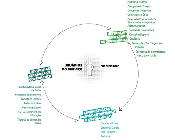 O sistema de governança do IFFar engloba: I) operação de unidades diretamente relacionadas ao propósito (portanto, em âmbito estrutural de governança), como instâncias de assessoramento/deliberação — Colegiado de Campus, Colégio de Dirigentes (Codir), Conselho Superior (Consup), Comitê de Governança, Riscos e Controles, entre outros —, e de avaliação, controle, prevenção e tratamento de riscos — a exemplo da Auditoria Interna, Comissão de Ética, Comissão Permanente de Sindicâncias e Inquéritos Administrativos, Procuradoria Jurídica e Diretoria de Governança, Riscos e Controles; e II) acesso e participação diretos da sociedade na gestão, com garantia de participação em órgãos consultivos e/ou deliberativos Conselho Superior, Colegiado de Campus e disponibilização de canais de aproximação (Serviço de Informação ao Cidadão e Ouvidoria). A imagem abaixo demonstra a Estrutura de governança do IFFar: