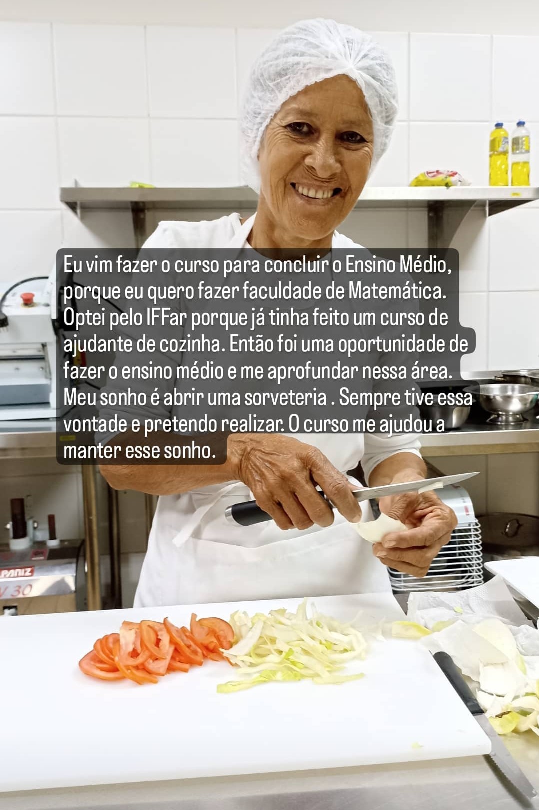 Depoimento da aluna aluna formada no curso, Fátima Navarro, que após concluir o curso, começou a trabalhar no refeitório do IFFar como Cozinheira.
