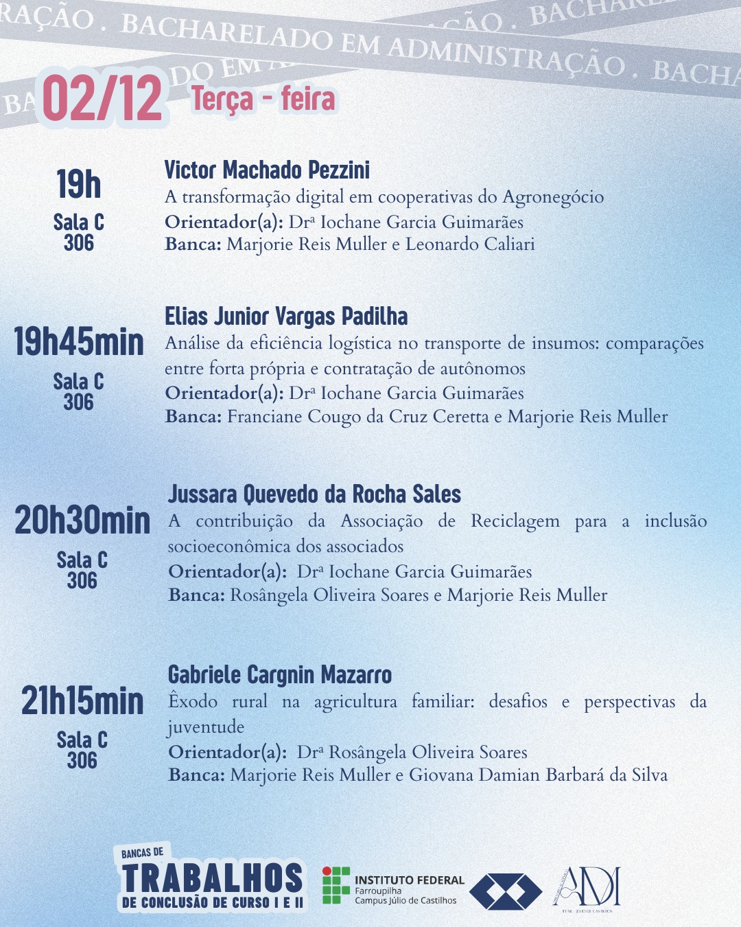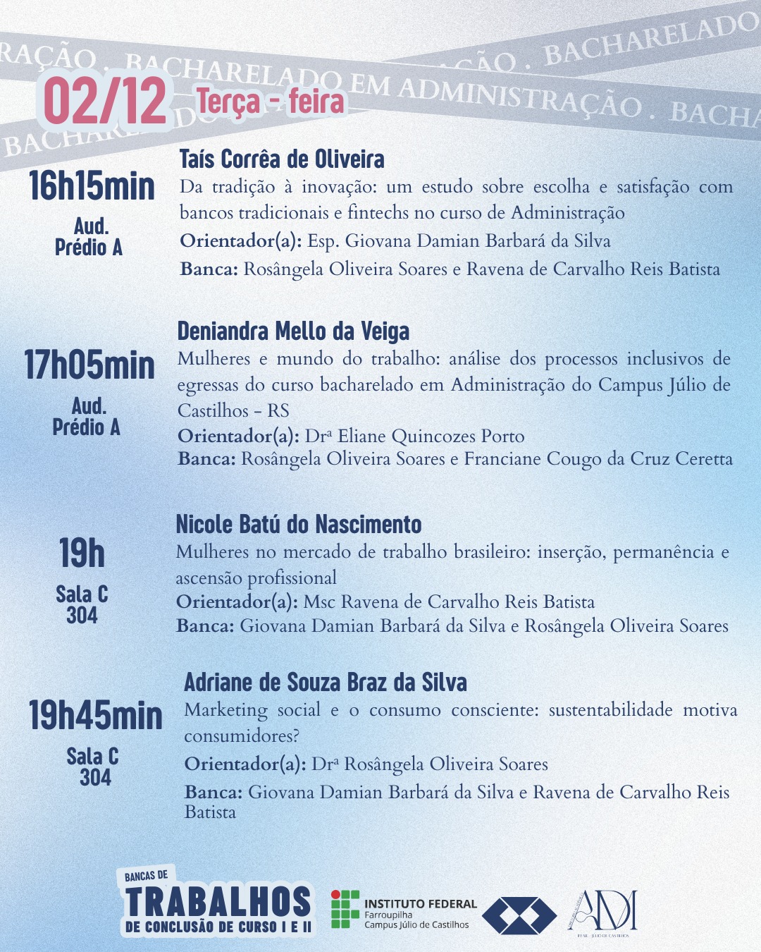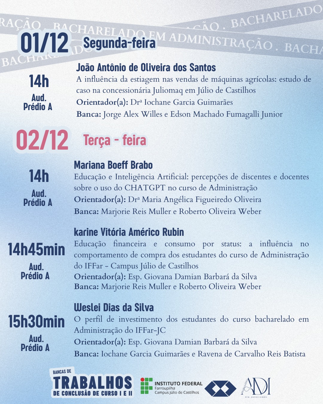 Entre os dias 1º, 2 e 4 de dezembro de 2025, o Campus Júlio de Castilhos contará com um dos momentos mais importantes para os acadêmicos do Curso de Bacharelado em Administração: as bancas de defesa dos Trabalhos de Conclusão de Curso I e II (TCCs).