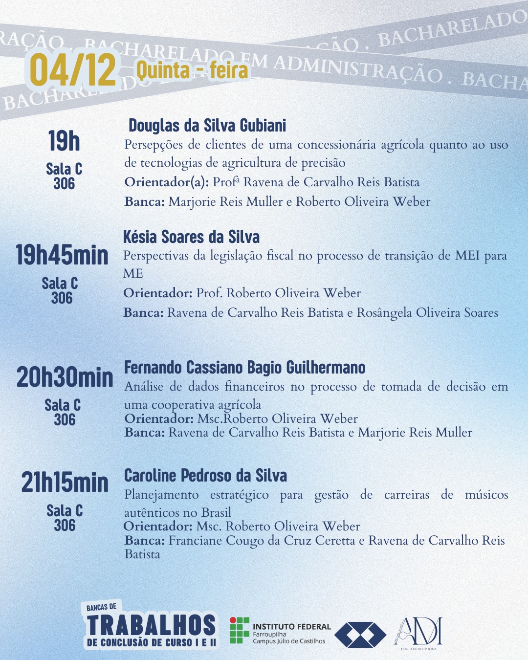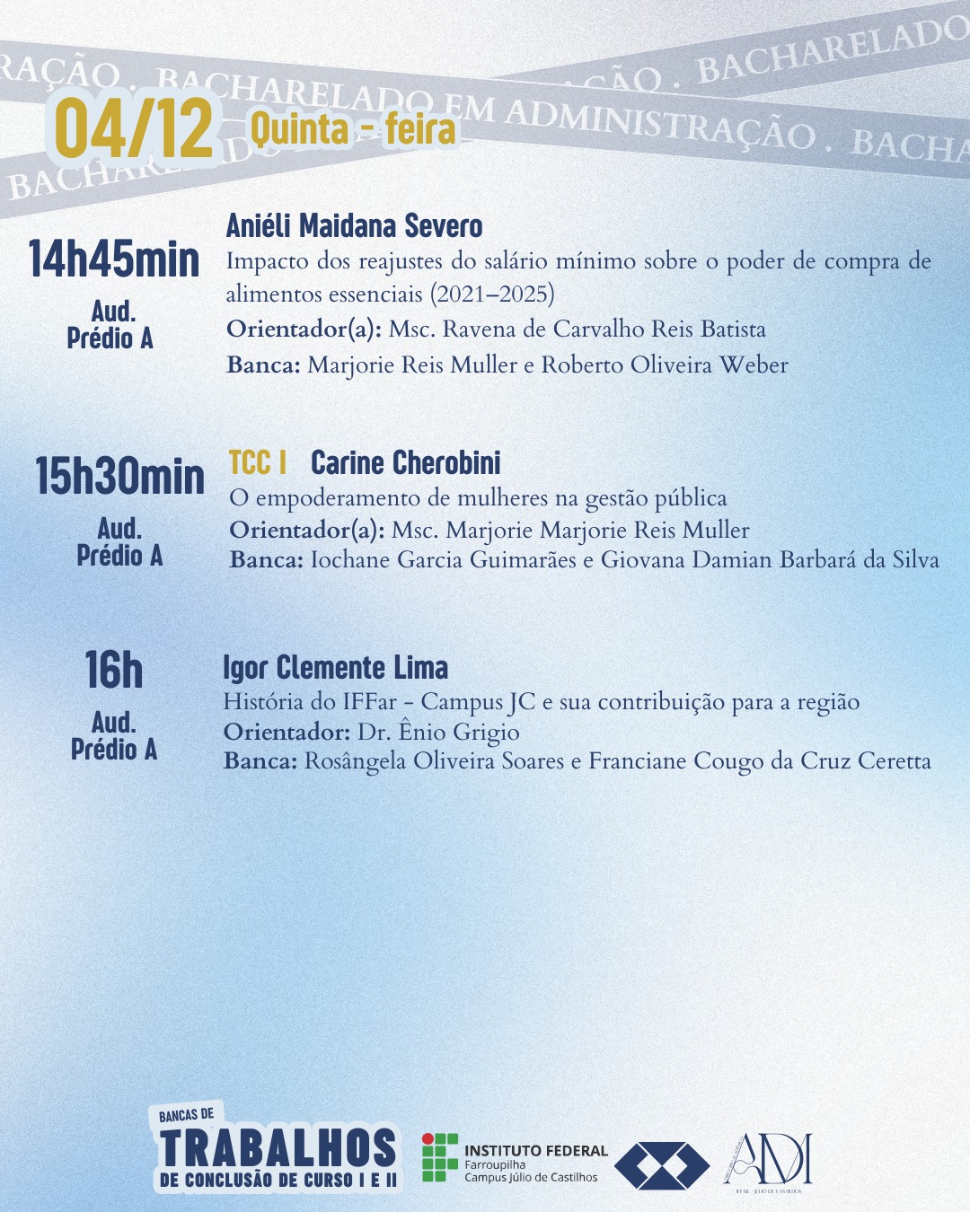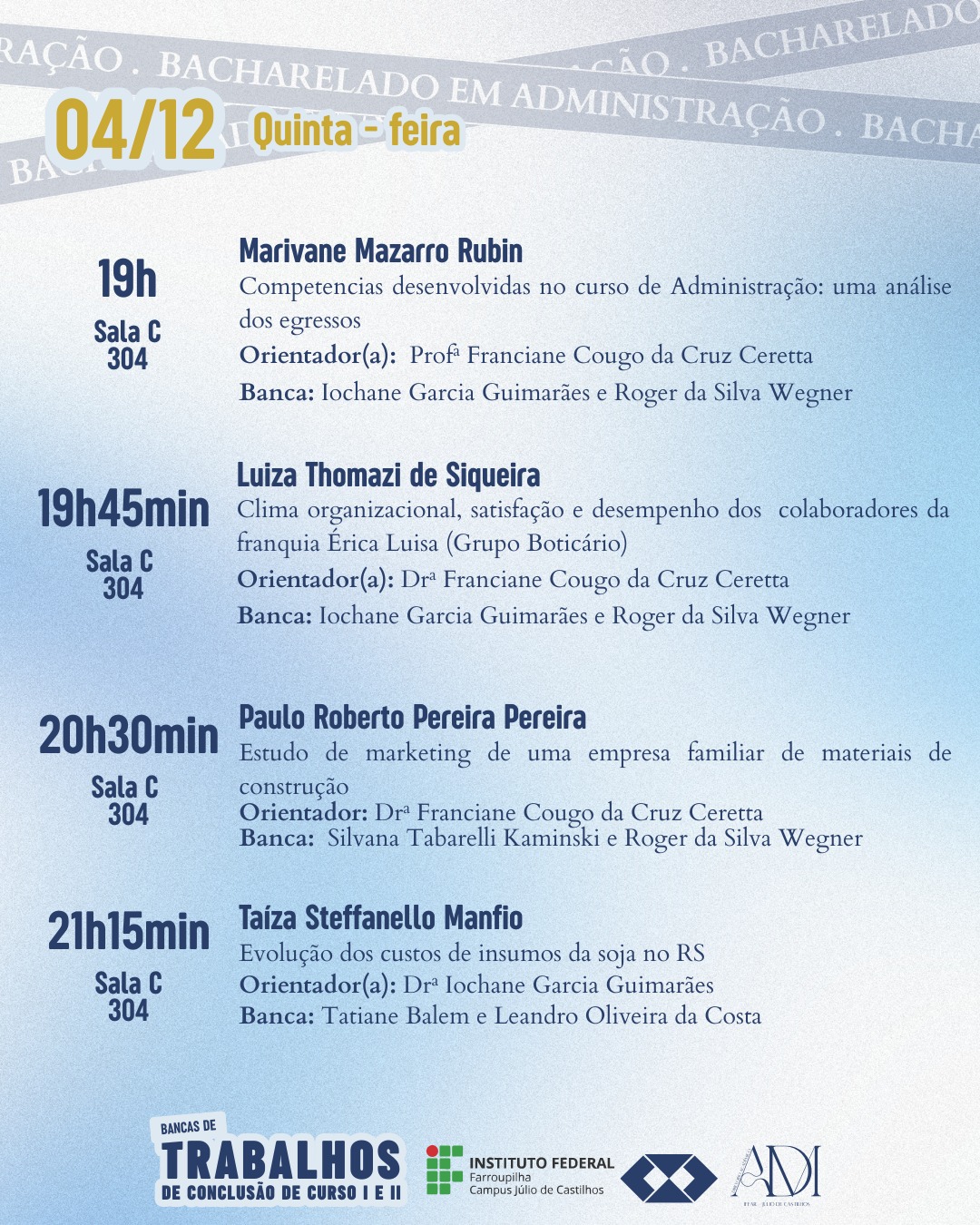 Entre os dias 1º, 2 e 4 de dezembro de 2025, o Campus Júlio de Castilhos contará com um dos momentos mais importantes para os acadêmicos do Curso de Bacharelado em Administração: as bancas de defesa dos Trabalhos de Conclusão de Curso I e II (TCCs).