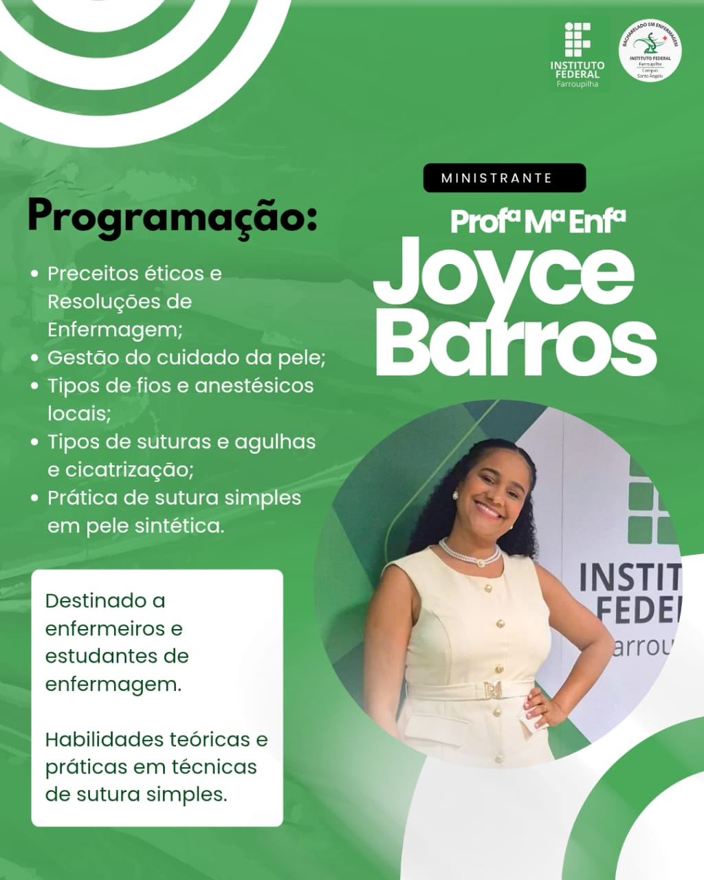 O Instituto Federal Farroupilha – Campus Santo Ângelo realizará, a partir de fevereiro de 2026, o Curso de Verão: Habilitação em Sutura Simples, com o objetivo de capacitar enfermeiros e estudantes de Enfermagem no desenvolvimento de habilidades teóricas e práticas relacionadas às técnicas de sutura simples, promovendo a qualificação profissional e o aperfeiçoamento do cuidado em saúde.