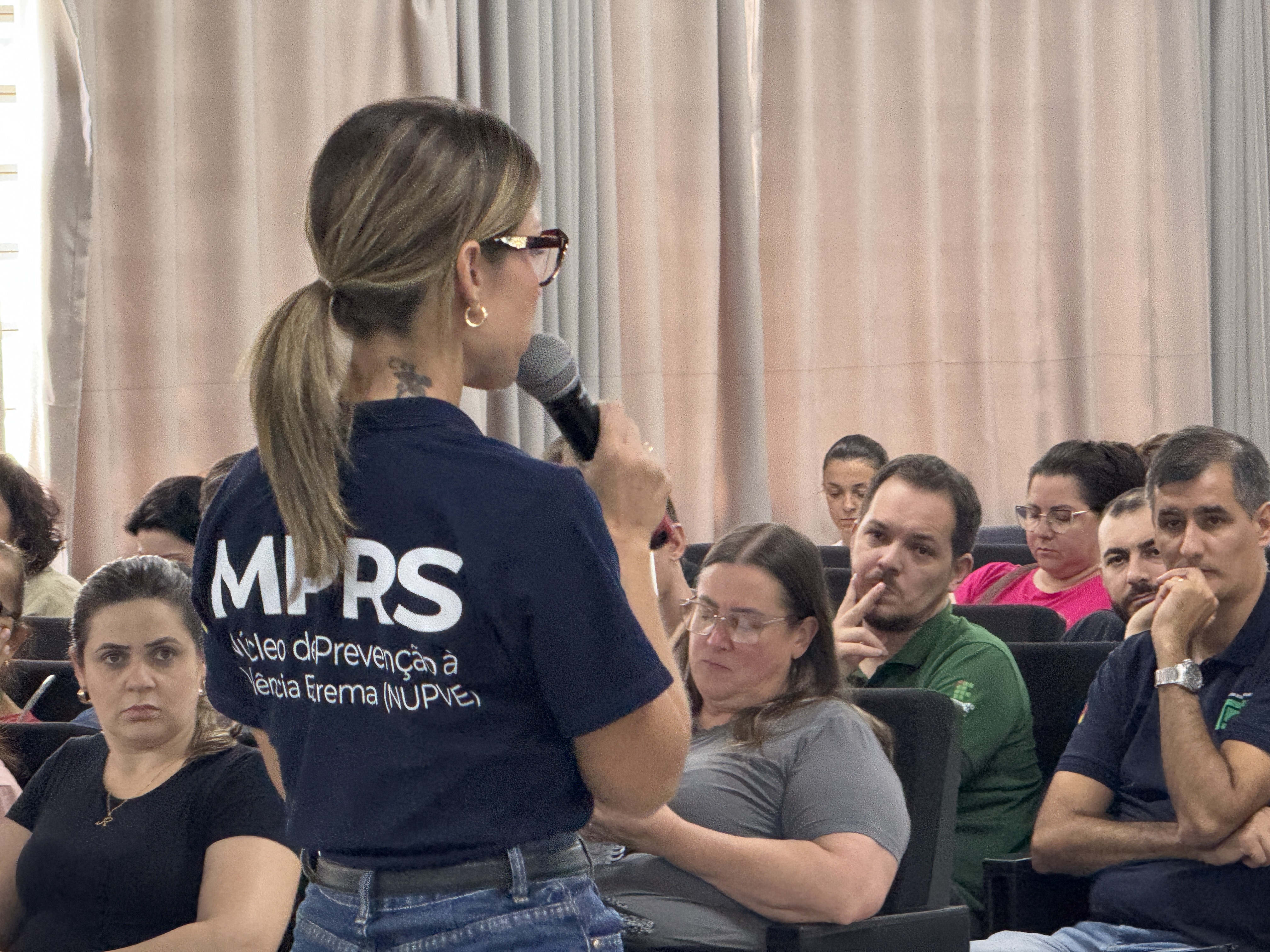 A atividade foi conduzida pela promotora de Justiça Manuela Paradeda Montanari, titular da 2ª Promotoria de Justiça de Palmeira das Missões e integrante do Núcleo de Prevenção à Violência Extrema do MPRS. Durante a apresentação, a promotora compartilhou informações e orientações sobre comportamentos e sinais que podem indicar que crianças e adolescentes estão sendo aliciados por predadores digitais.