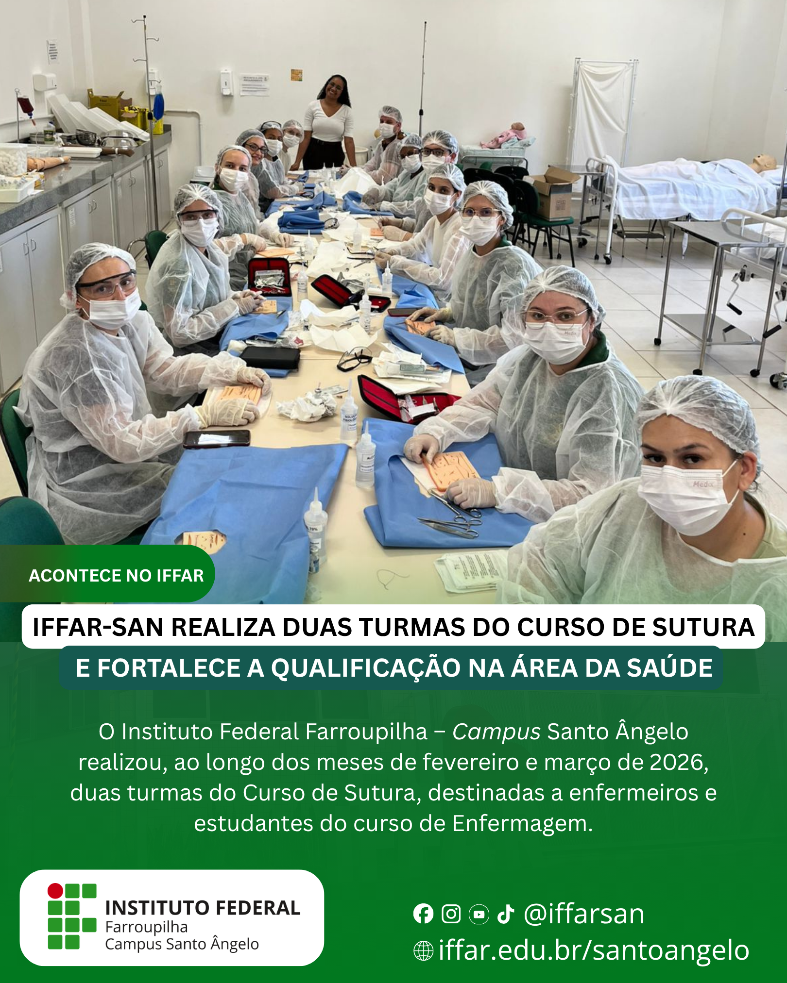 O Instituto Federal Farroupilha – Campus Santo Ângelo (IFFar-SAn) realizou, ao longo dos meses de fevereiro e março de 2026, duas turmas do Curso de Sutura, destinadas a enfermeiros e estudantes do curso de Enfermagem.