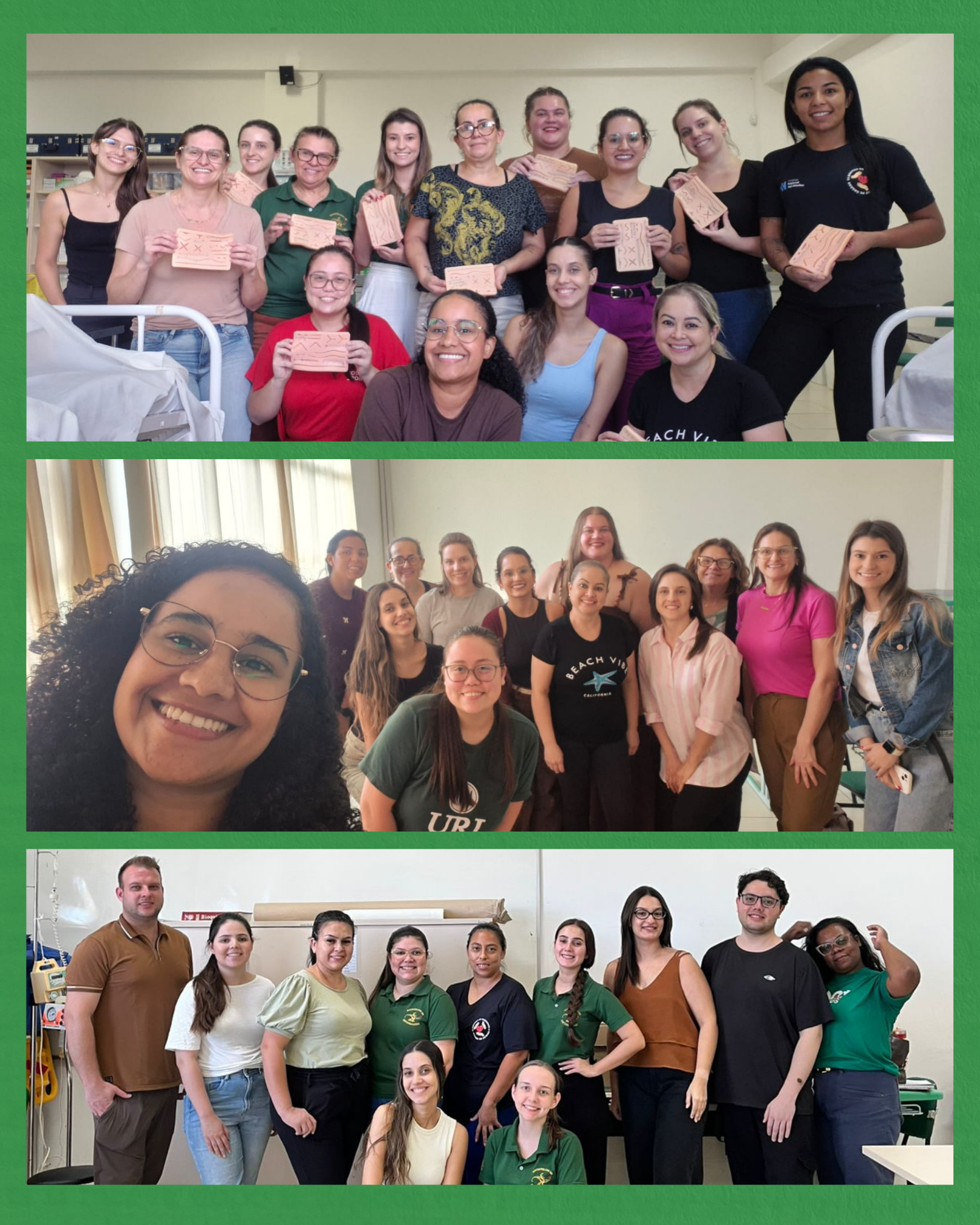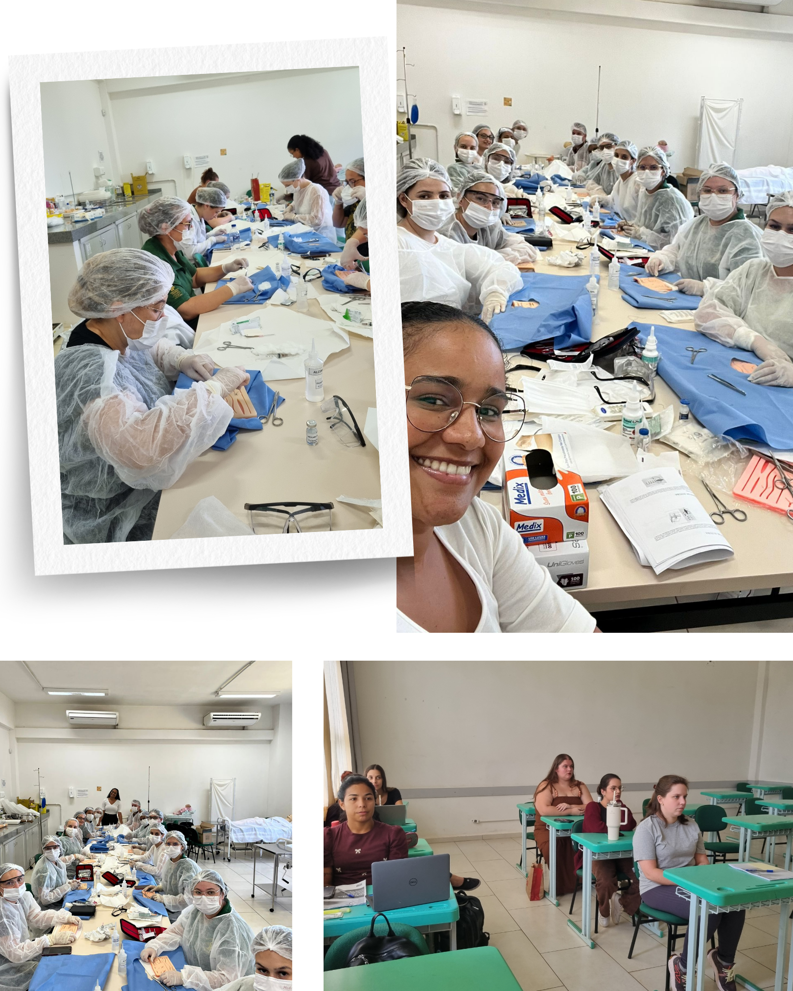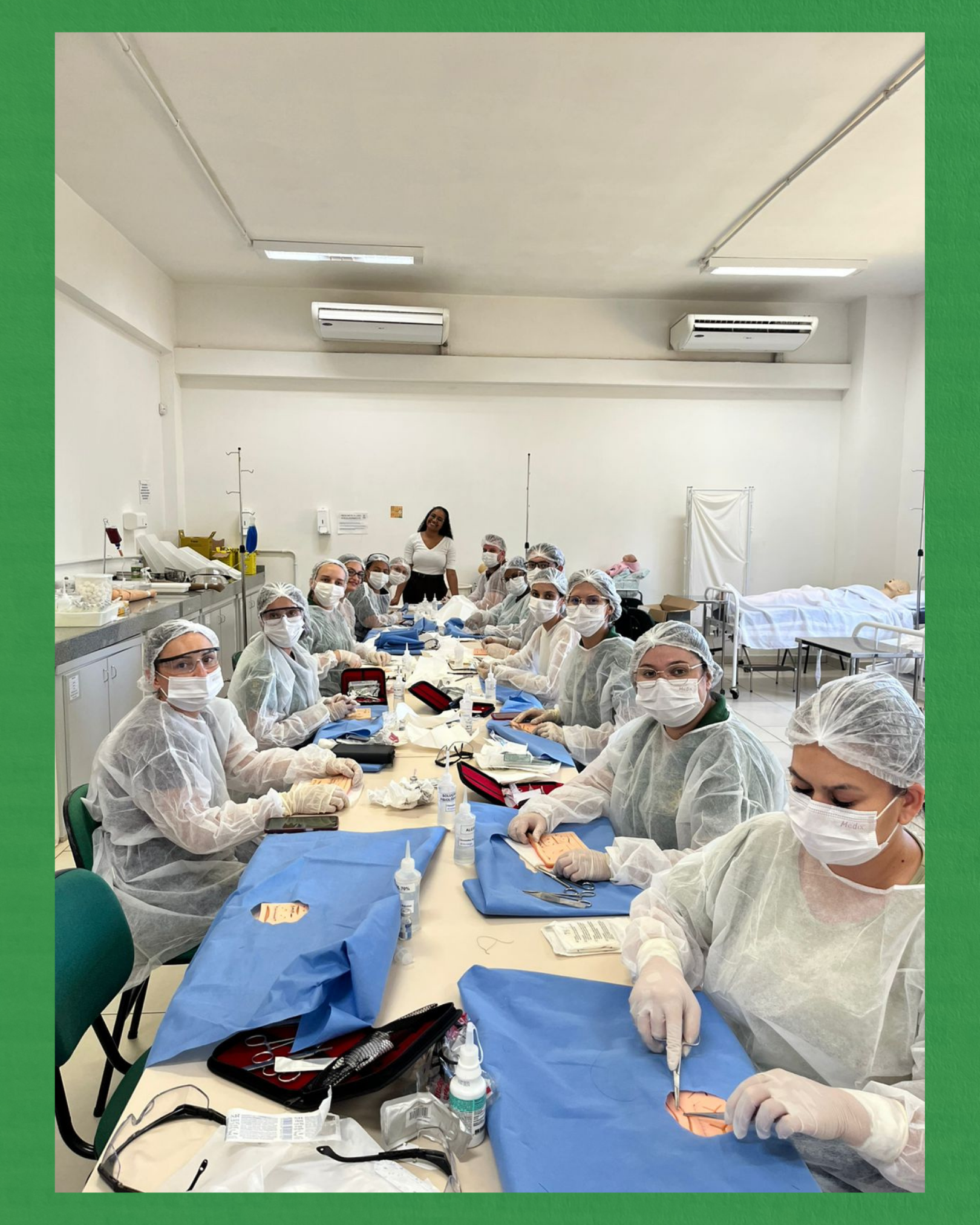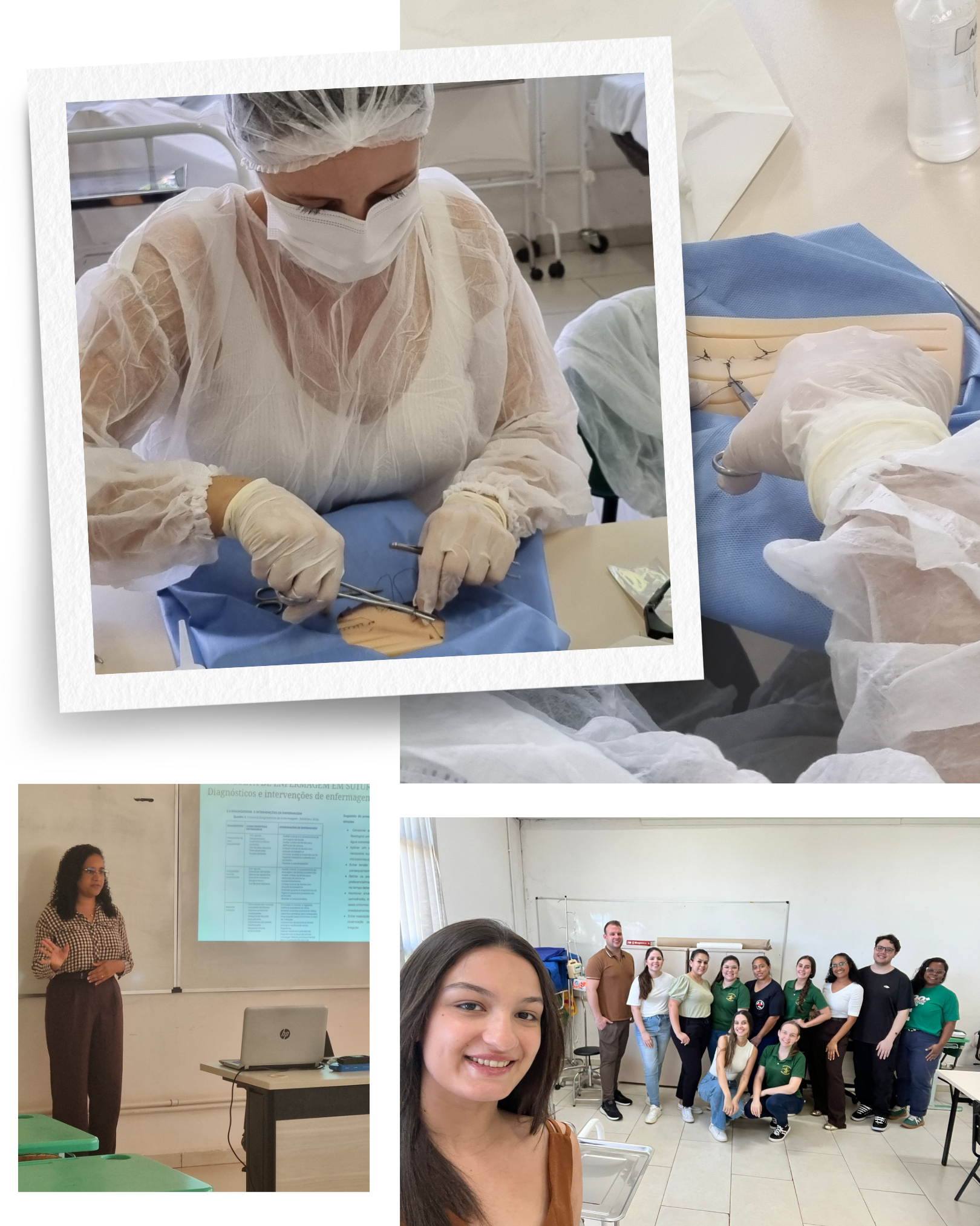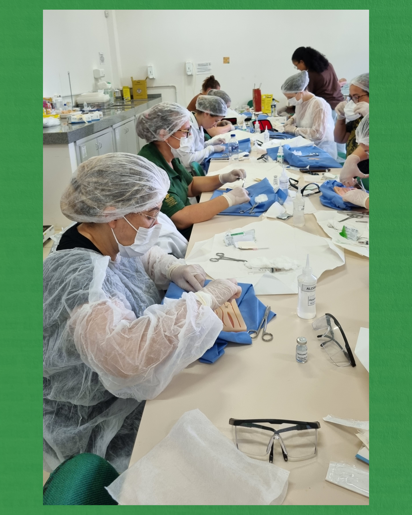 Durante as formações, foram abordados conteúdos como preceitos éticos e resoluções de Enfermagem, gestão do cuidado da pele, tipos de fios e anestésicos locais, tipos de suturas, agulhas e cicatrização, além da prática de sutura simples em pele sintética.