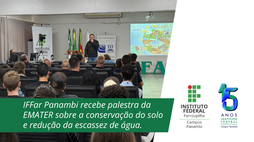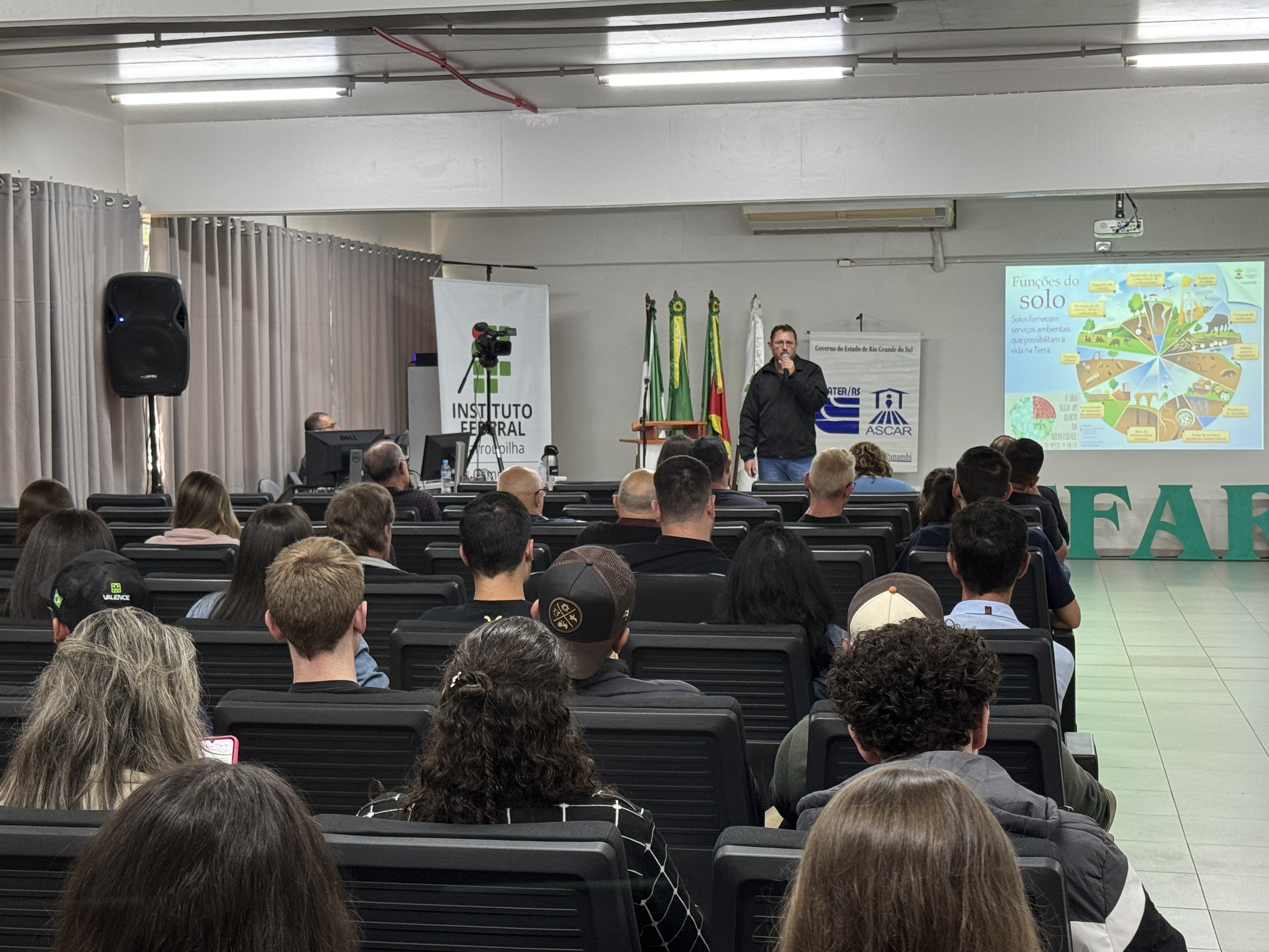 No dia 24 de abril de 2025, o IFFar Panambi realizou uma palestra em parceria com a EMATER com o tema “Como armazenar mais água no solo e reduzir os efeitos das estiagens”. Participaram do evento duas turmas do curso de Agronomia e três turmas do curso técnico integrado em Agricultura.