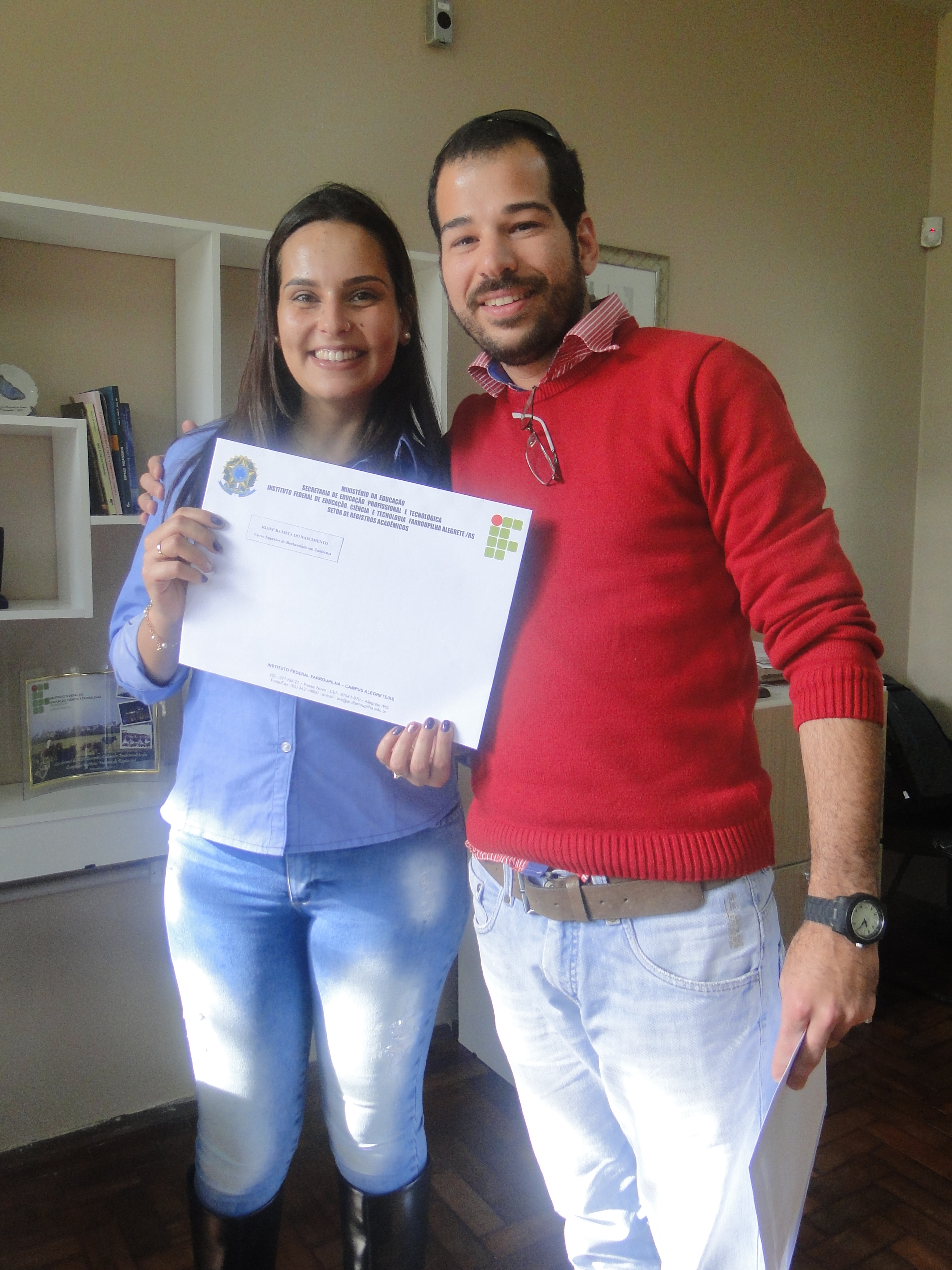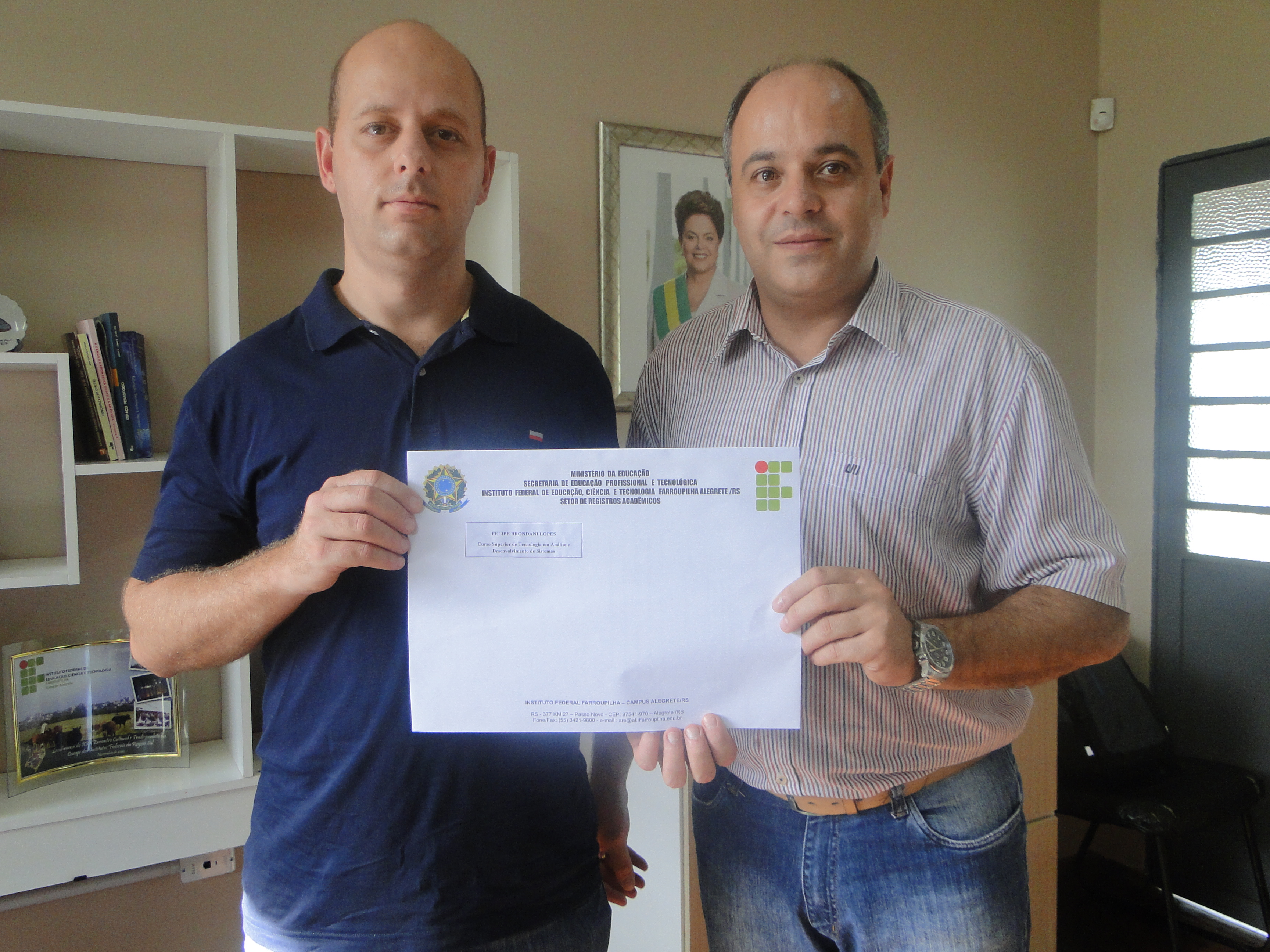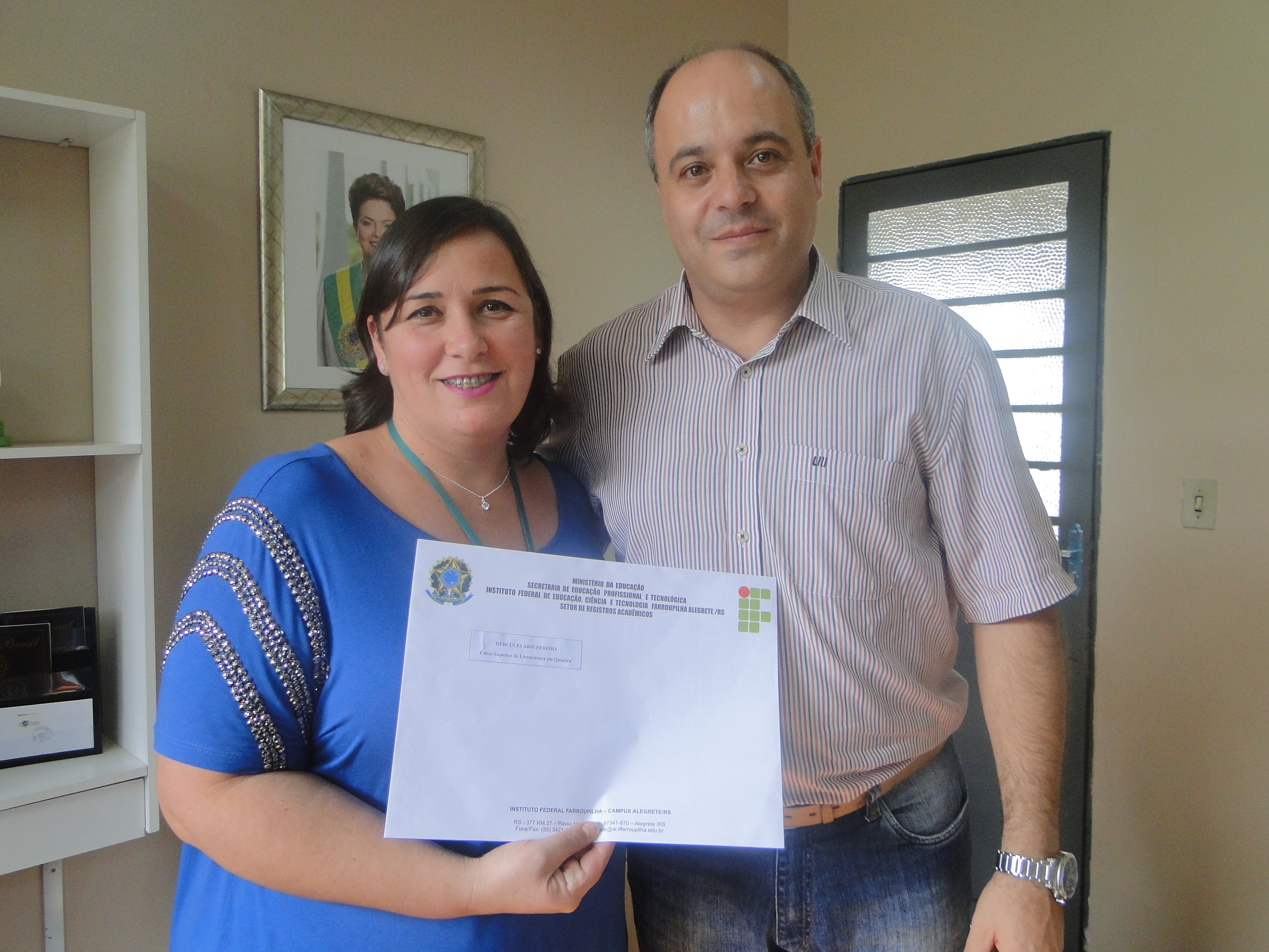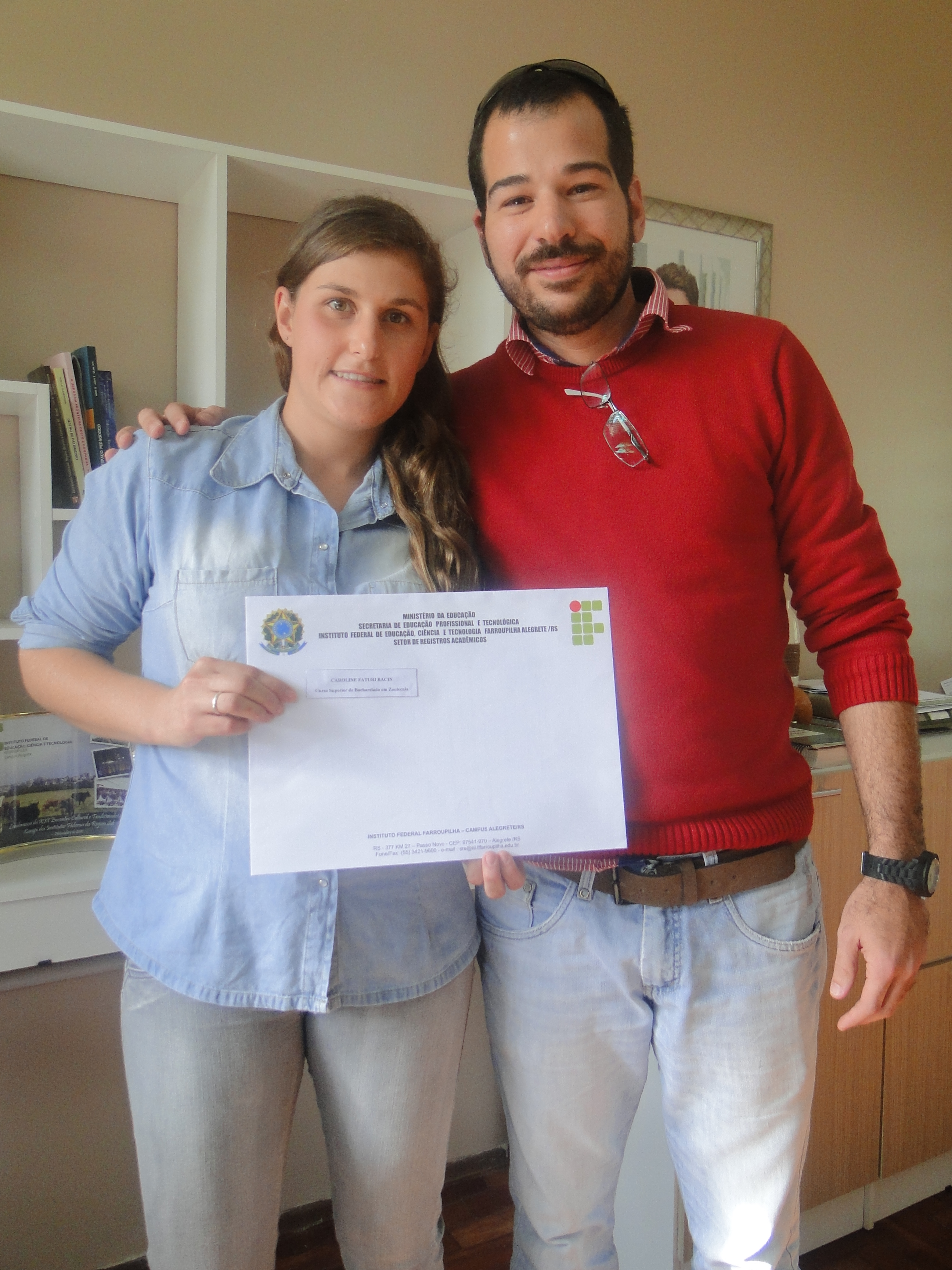 Na tarde de 26/12 dois alunos de Cursos Superiores realizaram a solenidade de formatura em gabinete, antecipadamente à solenidade de conclusão de suas turmas. Cleiton Anarolino graduou-se em Licenciatura em Química e está partindo para novos desafios profissionais em outro estado. Já Karine Graffunder formou-se em Licenciatura em Ciências Biológicas e está indo cursar mestrado na Universidade Federal de Santa Maria.