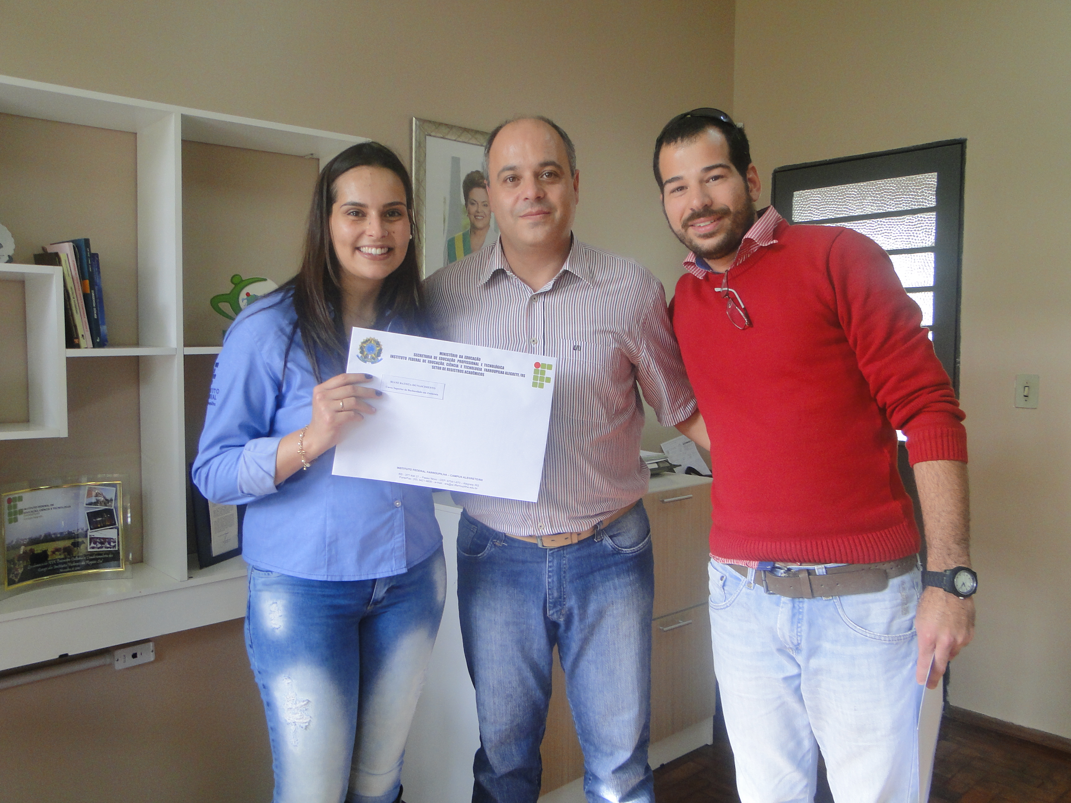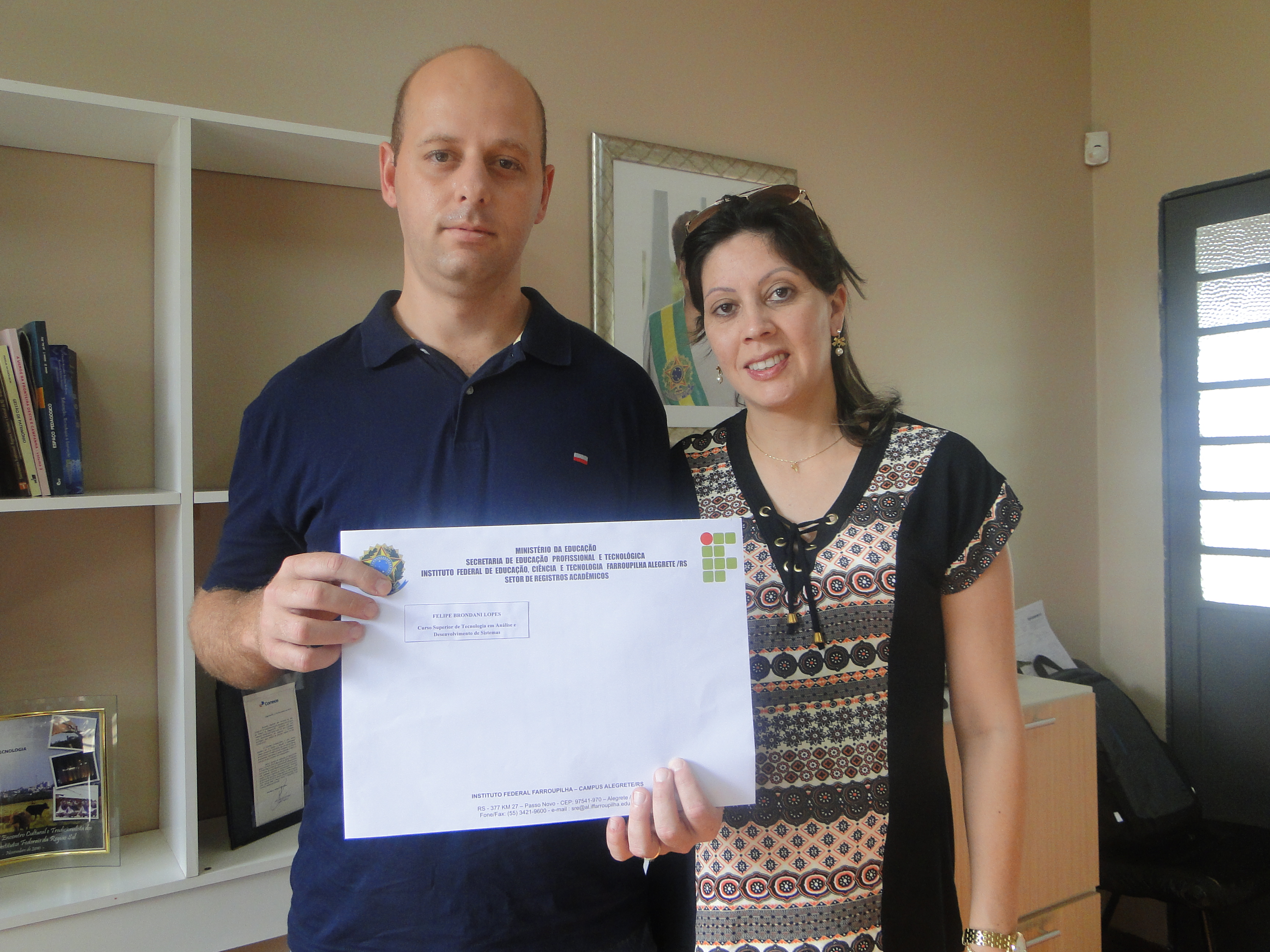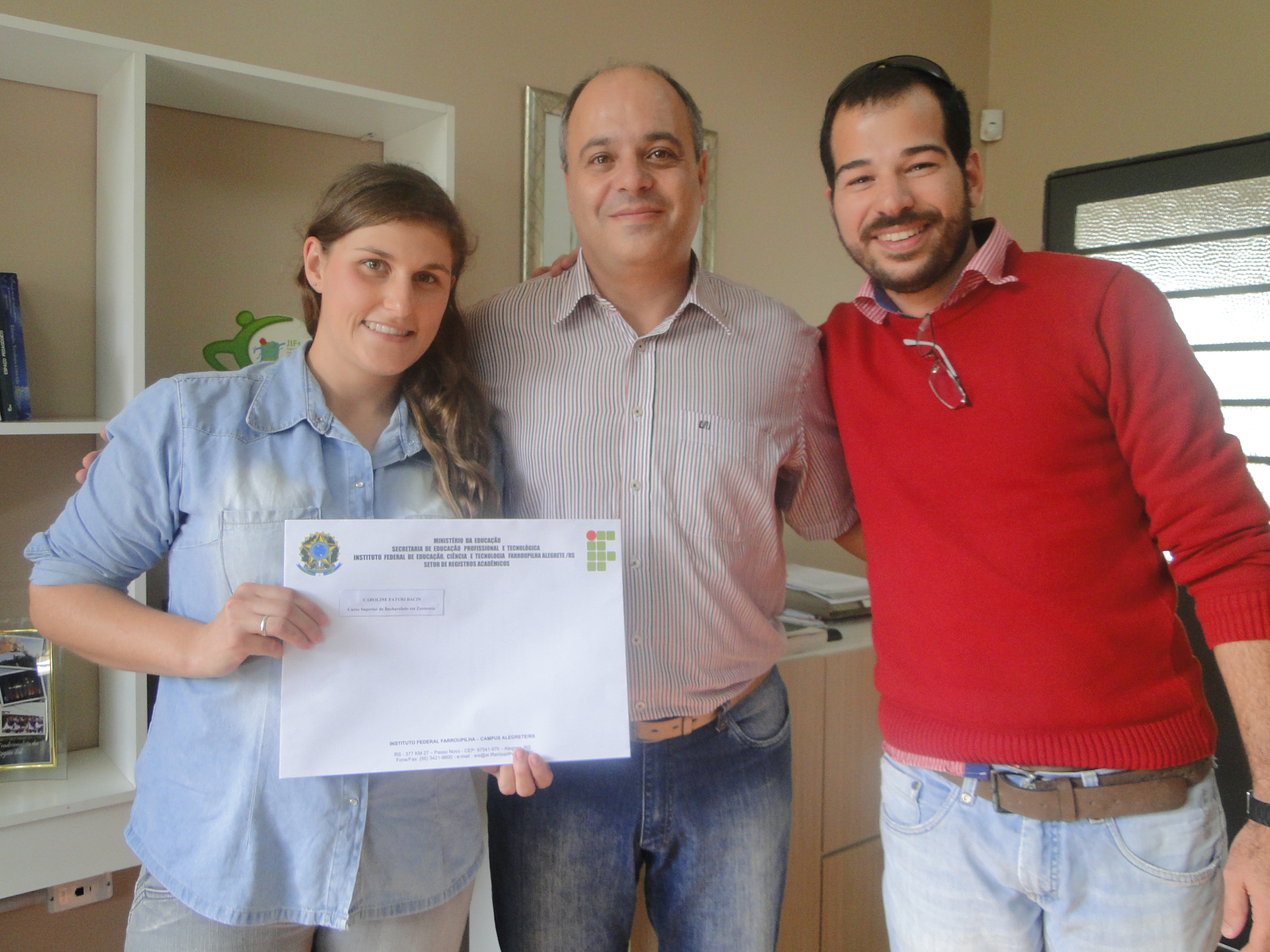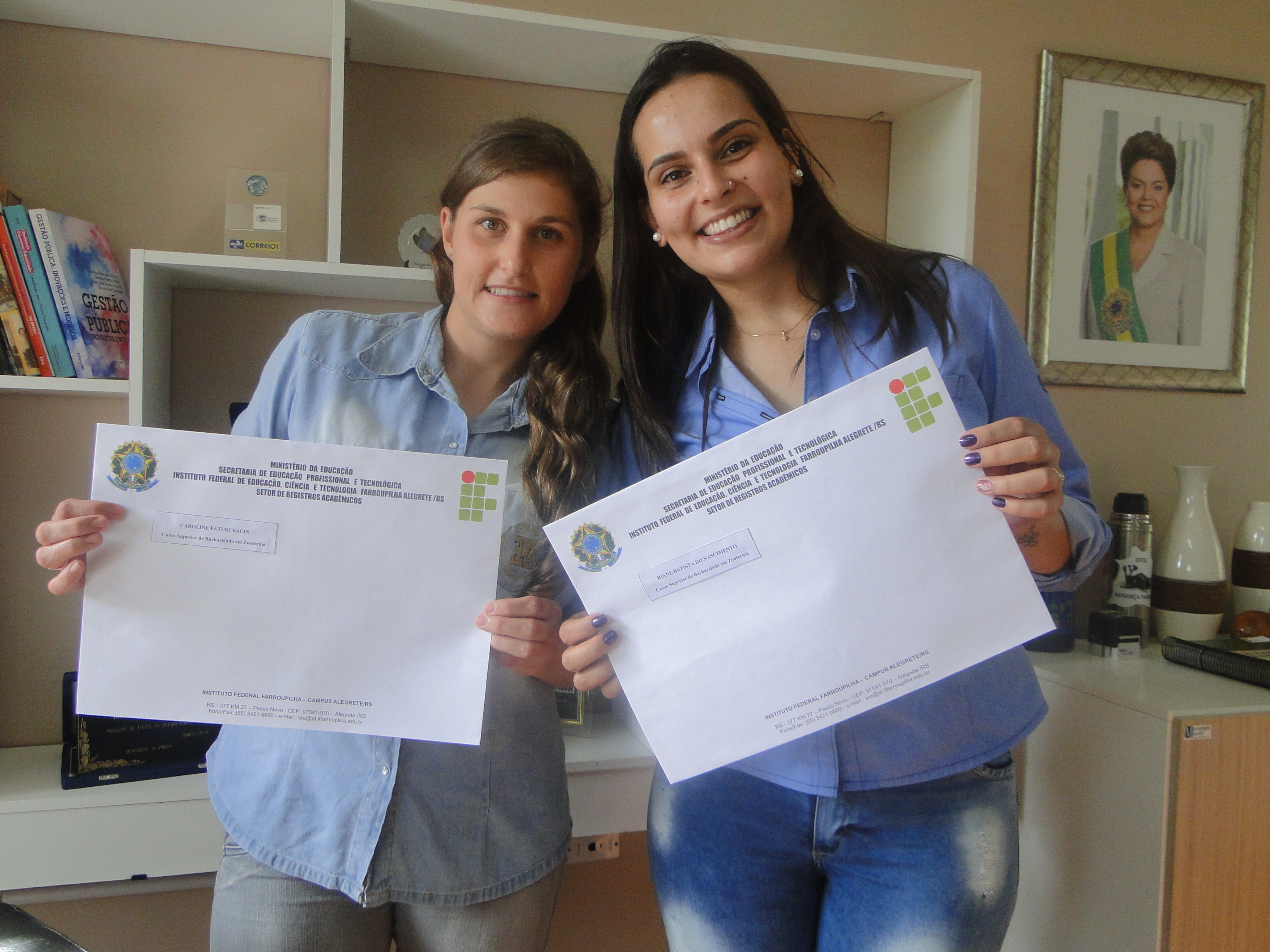 Na tarde de 26/12 dois alunos de Cursos Superiores realizaram a solenidade de formatura em gabinete, antecipadamente à solenidade de conclusão de suas turmas. Cleiton Anarolino graduou-se em Licenciatura em Química e está partindo para novos desafios profissionais em outro estado. Já Karine Graffunder formou-se em Licenciatura em Ciências Biológicas e está indo cursar mestrado na Universidade Federal de Santa Maria.