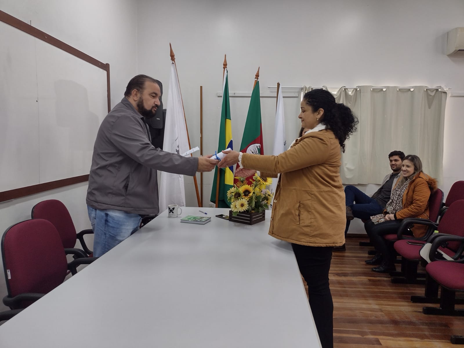 Na noite desta quinta-feira, dia 28 de março, a diretora-geral do IFFar – Campus Santa Rosa, Renata Rotta, outorgou o grau em cerimônia de gabinete para sete acadêmicos de cursos superiores da instituição. Participaram da cerimônia, realizada no Laboratório de Administração (LabDo), a coordenadora de Ensino, Raquel Ghellar Canova; as coordenadoras dos cursos, Kerlen Bezzi Engers (Ciências Biológicas), Lucilaine Goin Abitante (Matemática) e o professor Fernando Wawginiak, representando o coordenador do bacharelado em Administração, Claudio Hofler. O coordenator de Registros Acadêmicos, Delmar Lorscheiter, fez a leitura da Ata de formatura. Os formandos foram: