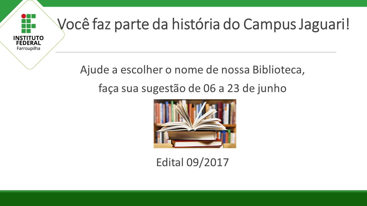 Está aberto o edital 09/2017, que regulamenta o concurso Interno para escolha do nome da Biblioteca do Campus Jaguari. O objetivo é escolher entre a comunidade do Campus o nome a ser adotado como identificação oficial da Biblioteca. Segue o link do edital: http://iffarroupilha.edu.br/component/k2/item/4966-EDITAL%2009/2017%20-%20CONCURSO%20PARA%20ESCOLHA%20DE%20NOME%20DA%20BIBLIOTECA%20DO%20IF%20FARROUPILHA%20CAMPUS%20JAGUARI