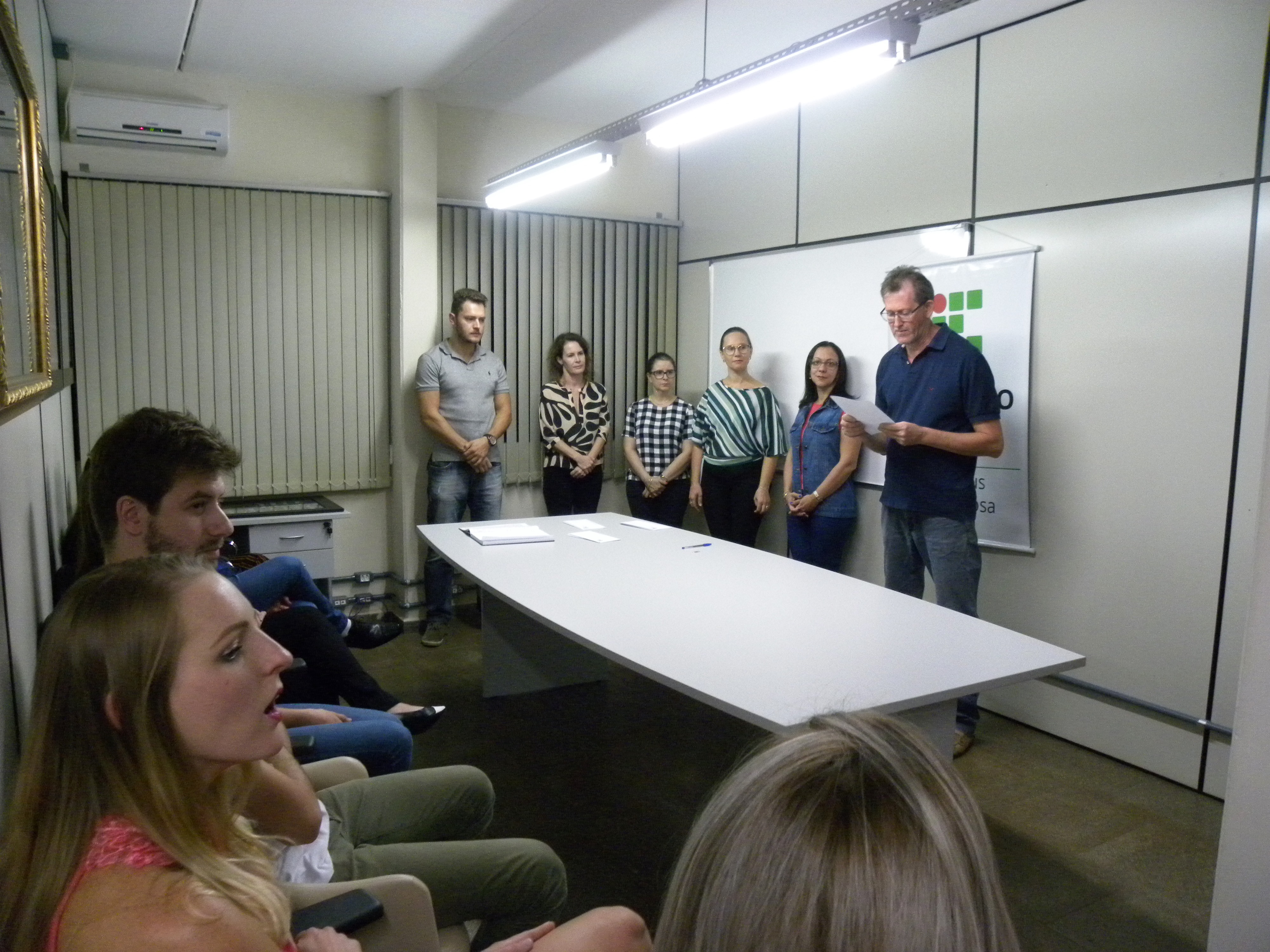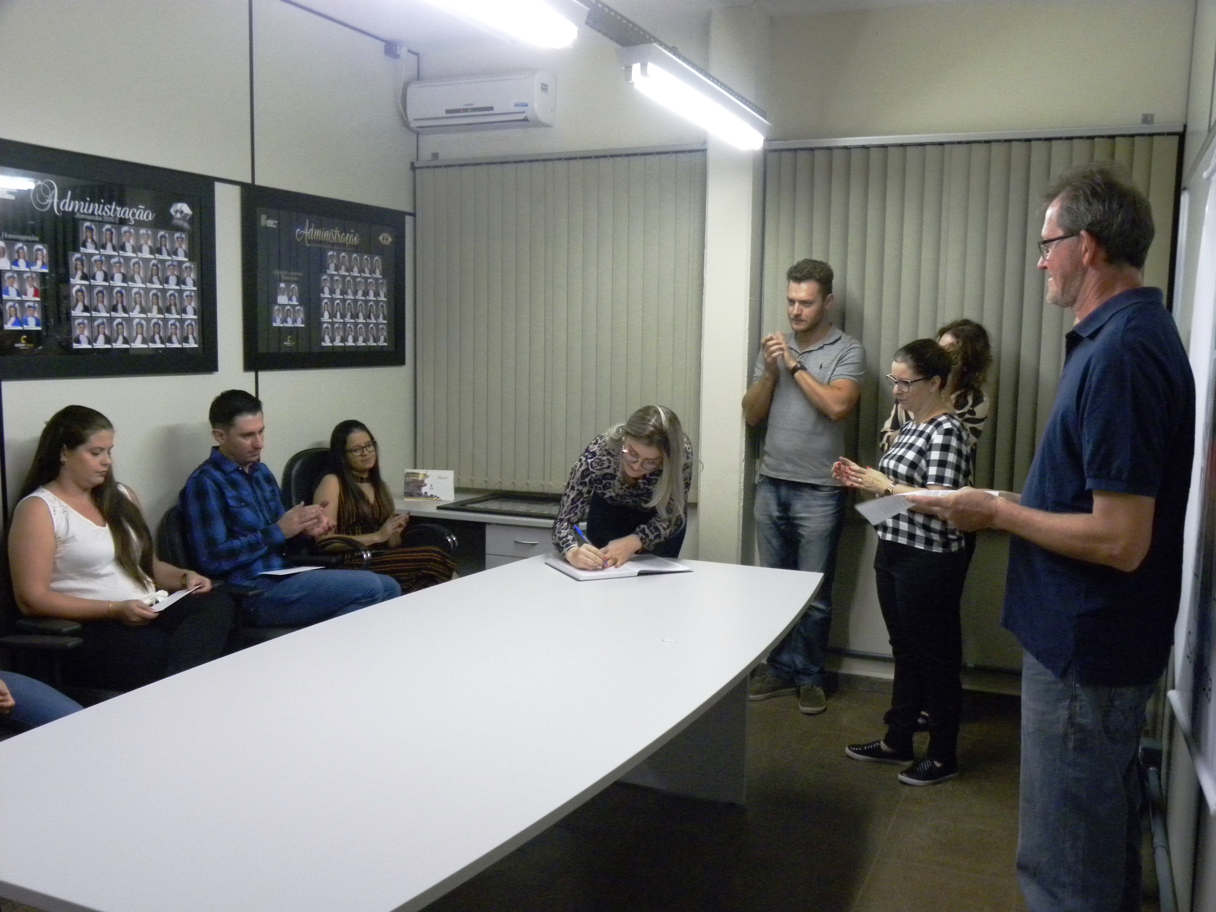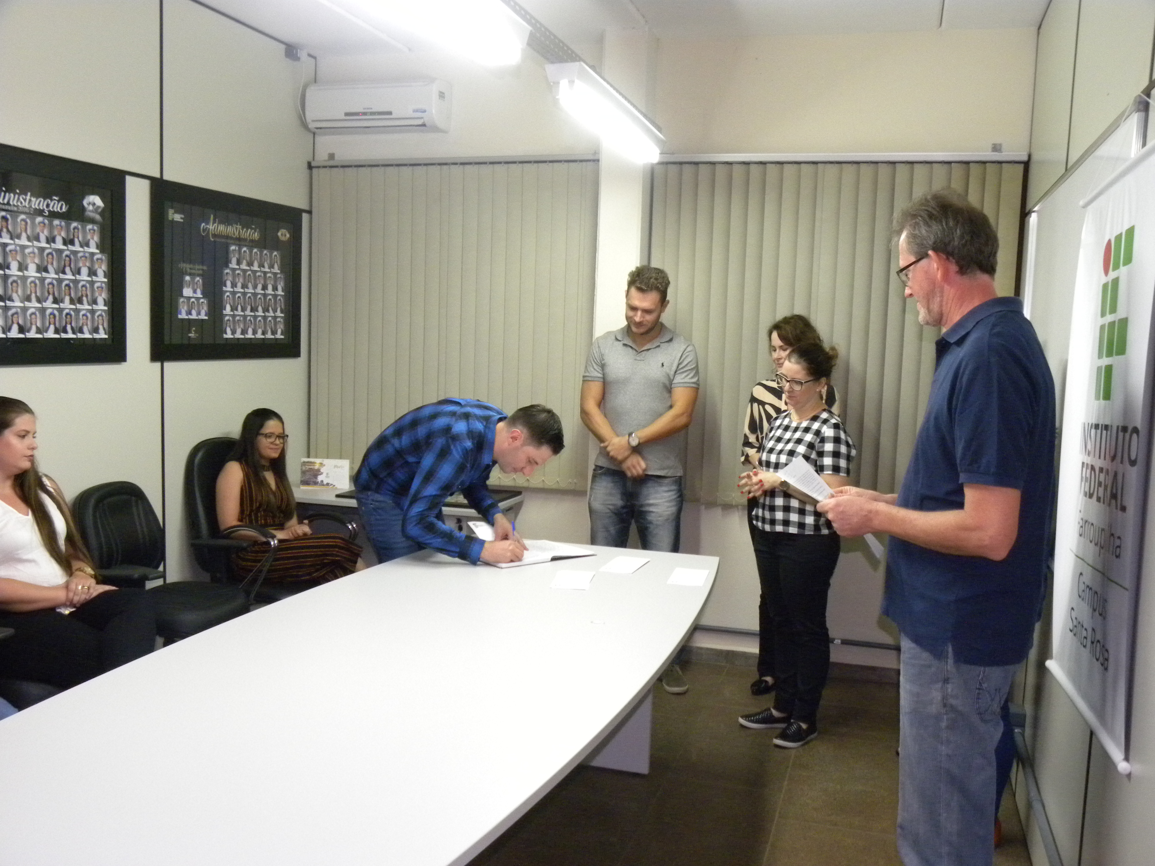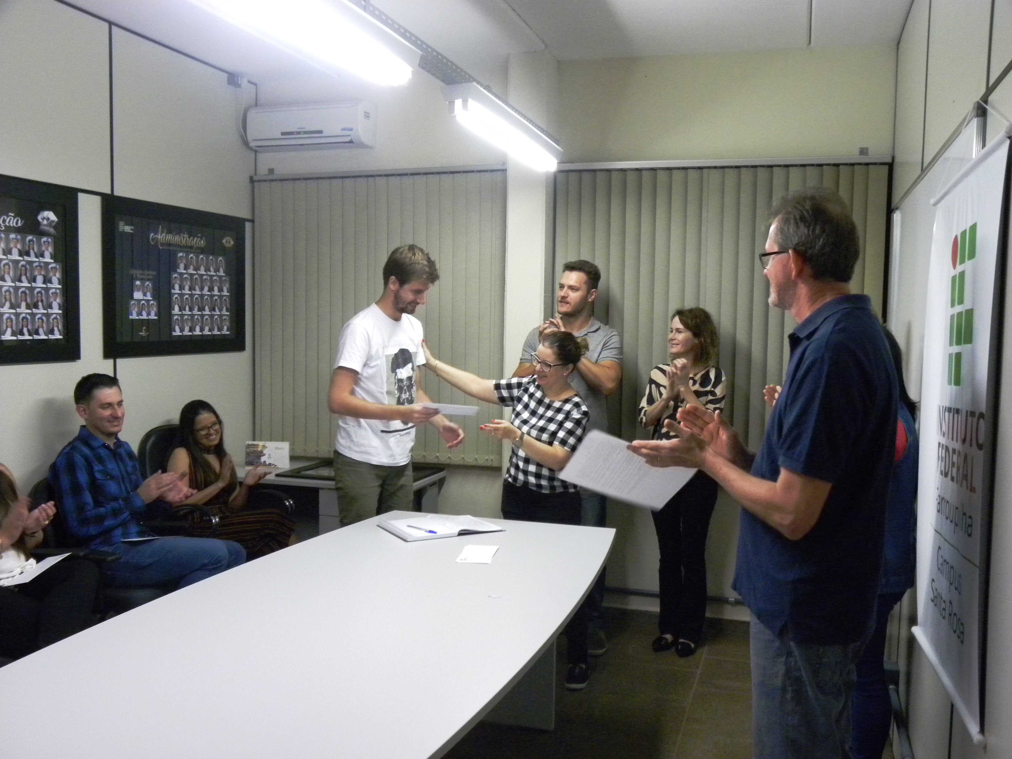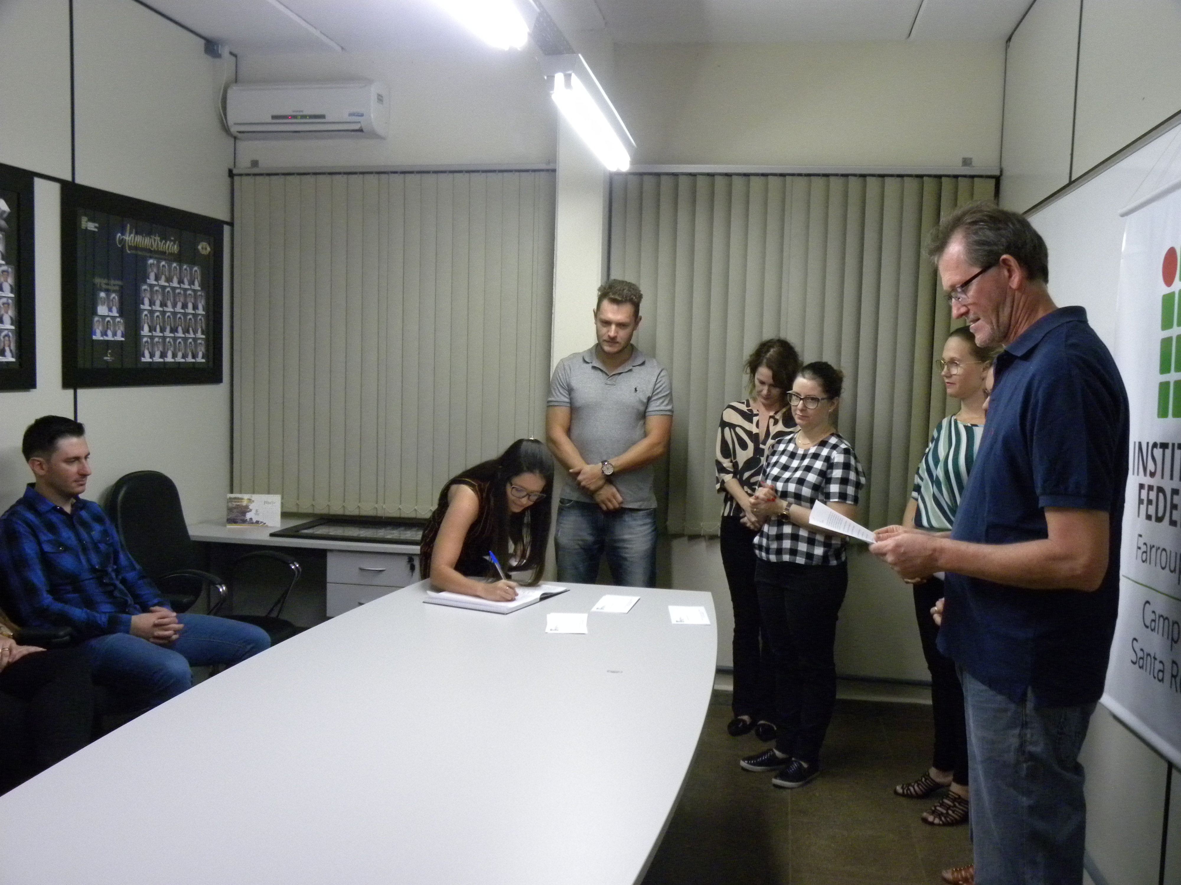 Na noite desta quinta-feira, dia 28 de março, a diretora-geral do IFFar – Campus Santa Rosa, Renata Rotta, outorgou o grau em cerimônia de gabinete para sete acadêmicos de cursos superiores da instituição. Participaram da cerimônia, realizada no Laboratório de Administração (LabDo), a coordenadora de Ensino, Raquel Ghellar Canova; as coordenadoras dos cursos, Kerlen Bezzi Engers (Ciências Biológicas), Lucilaine Goin Abitante (Matemática) e o professor Fernando Wawginiak, representando o coordenador do bacharelado em Administração, Claudio Hofler. O coordenator de Registros Acadêmicos, Delmar Lorscheiter, fez a leitura da Ata de formatura. Os formandos foram: