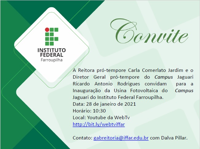 É com muita alegria que o Diretor Pro Tempore do Campus Jaguari Ricardo Antonio Rodrigues convida para a Inauguração da Usina Fotovoltaica do Campus Jaguari do Instituto Federal Farroupilha.