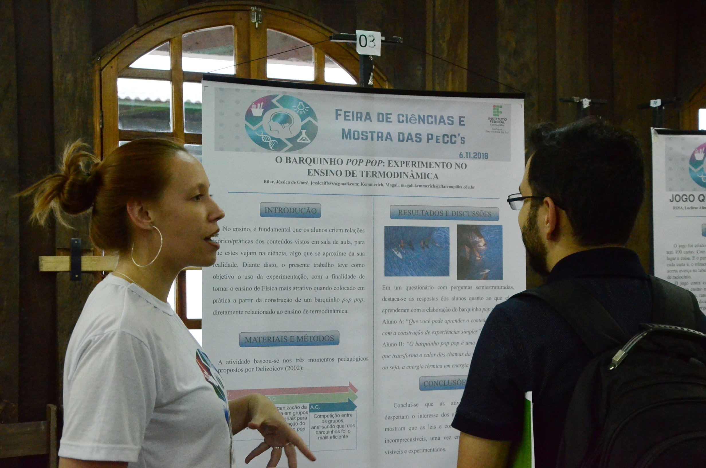 À noite, aconteceu a I Mostra das PeCCs, reunindo 29 trabalhos de acadêmicos(as) das licenciaturas do campus que apresentavam os resultados das práticas pedagógicas que eles(as) desenvolvem em tais cursos. Essas práticas geralmente são trabalhadas dentro das disciplinas e aplicadas em escolas da região, bem como em turmas do ensino integrado do IFFar-SVS.