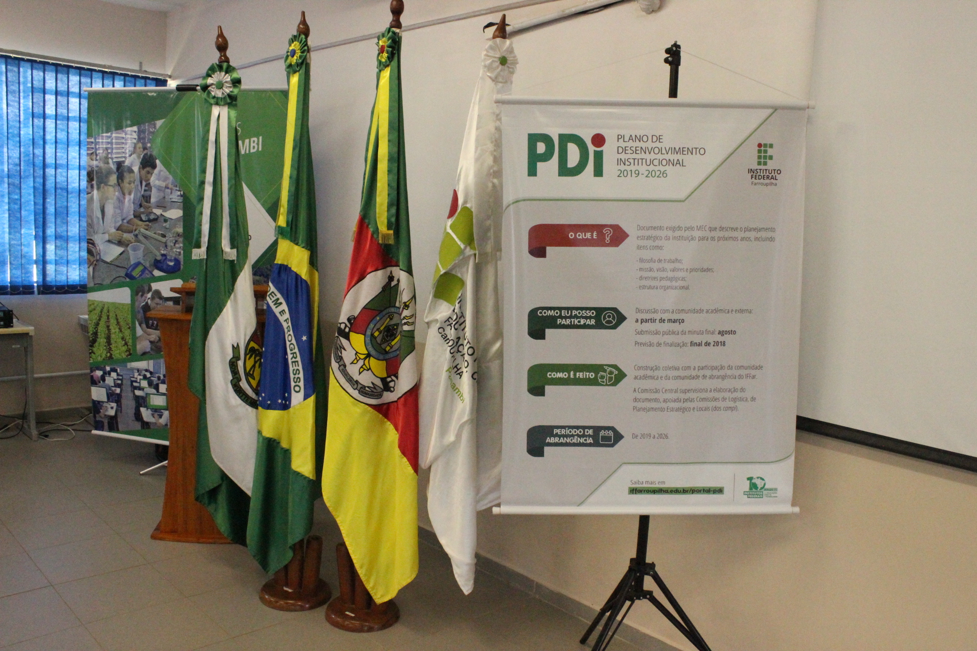 Neste ano, o Instituto Federal Farroupilha está em processo de elaboração do Plano de Desenvolvimento Institucional (PDI), que abrangerá o planejamento das ações do IFFar para os próximos oito anos – de 2019 a 2026. O PDI é um documento exigido pelo MEC que descreve o planejamento estratégico da instituição para os próximos anos, incluindo itens como filosofia de trabalho, missão, visão, valores e prioridades (cursos e modalidade de ensino), diretrizes pedagógicas e estrutura organizacional.