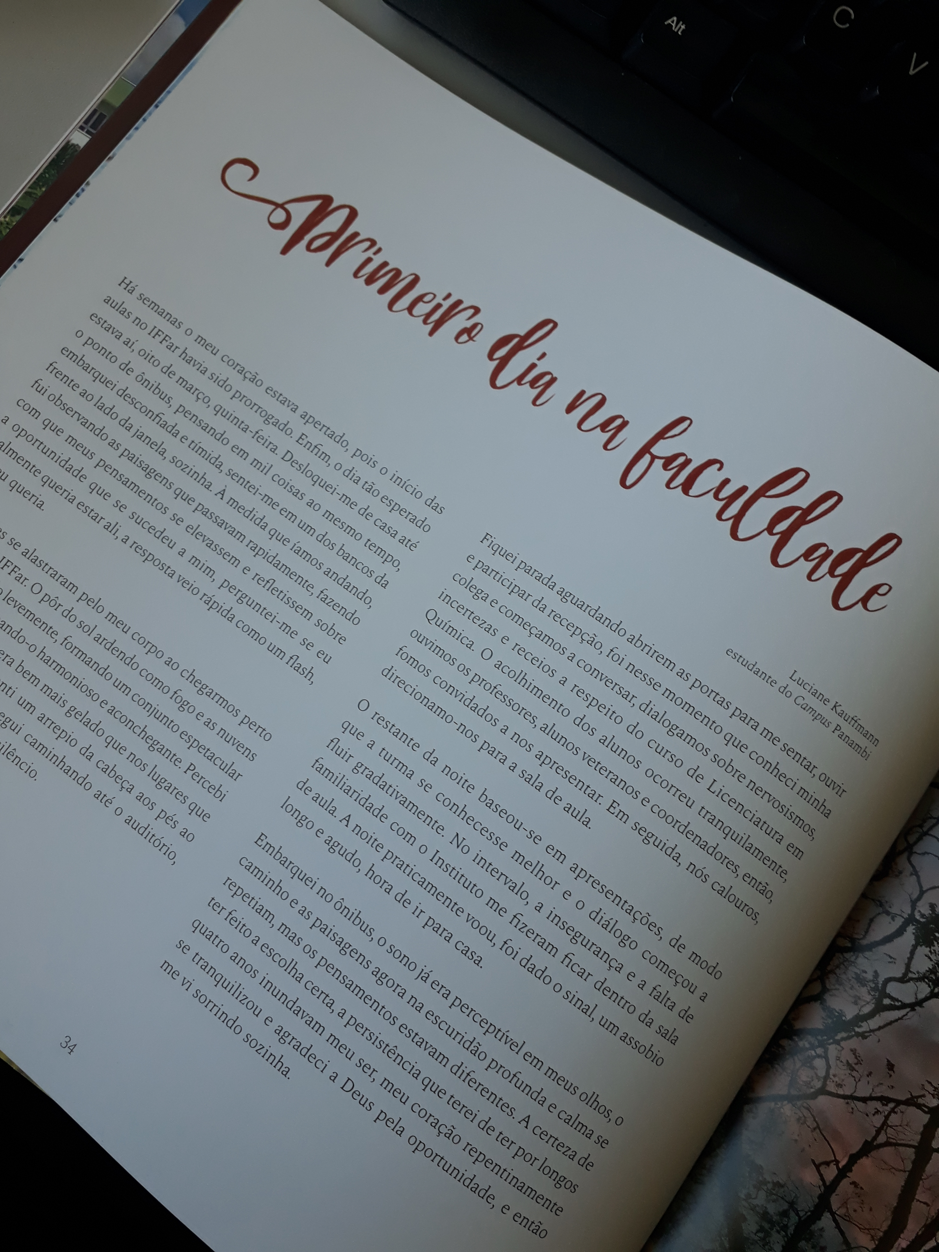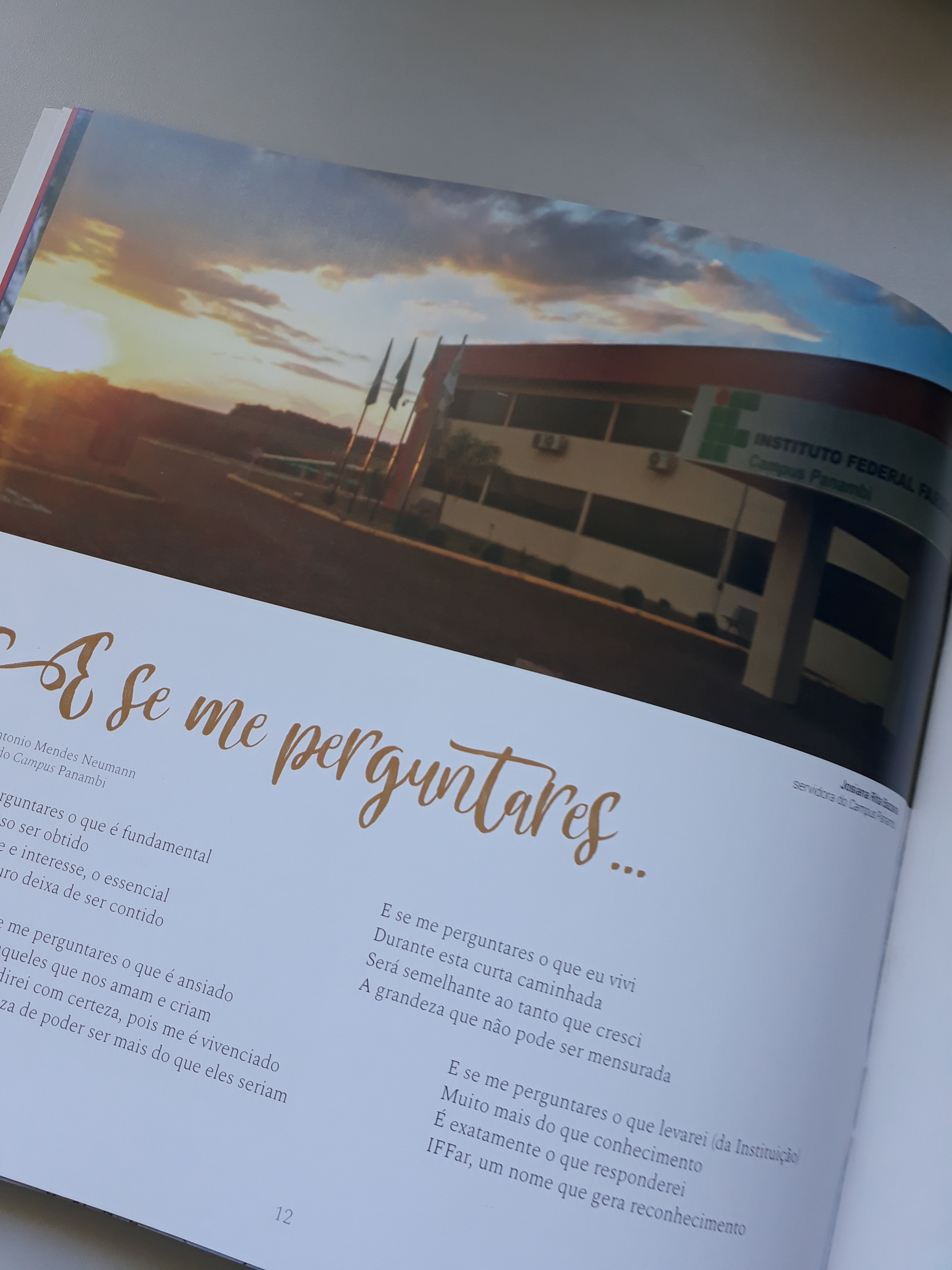 Estudantes, servidores e egressos foram desafiados a expressar os múltiplos significados sobre sua relação com a instituição. Como resultado do 2º Concurso de Fotografias e do Concurso Literário do IFFar, dez participantes do Campus Panambi tiveram suas produções selecionadas para integrar o livro "Significados e olhares: fotos, crônicas e poemas no IFFar”.