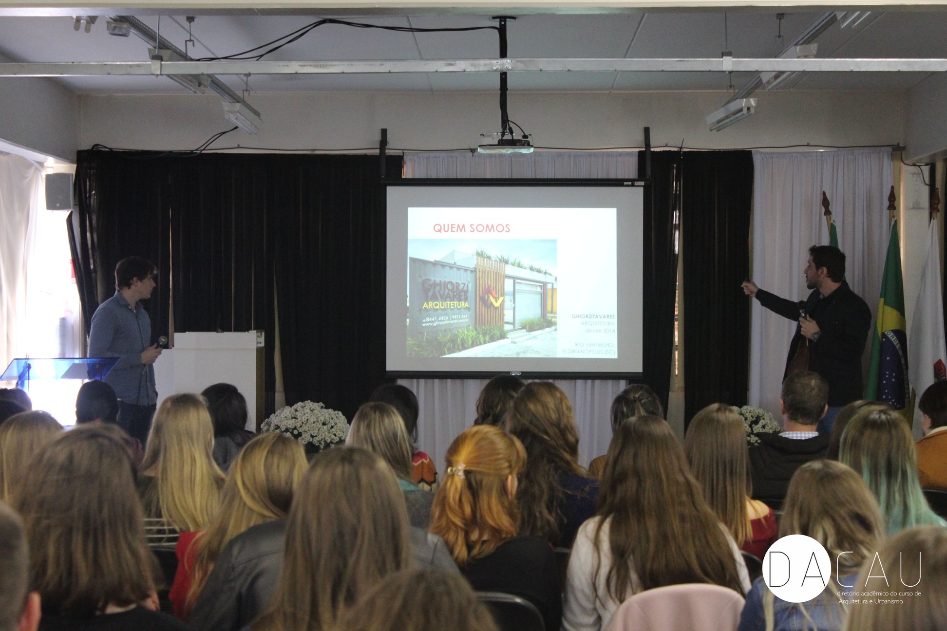 2º dia - As arquitetas Fernanda e Patricia da Prosa Arquitetura, de Santa Rosa, conversam sobre os desafios do ser Arquiteto. À tarde, palestra sobre Arquitetura Container e Sistemas de Construção Seca, com o Lucas Ghiorzi e o Gabriel Tavares, do escritório Ghiorzi Tavares Arquitetura, de Florianópolis.
