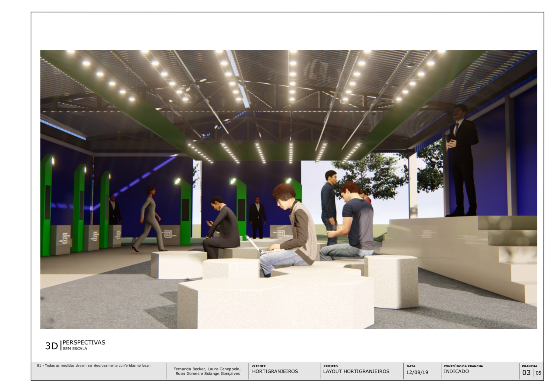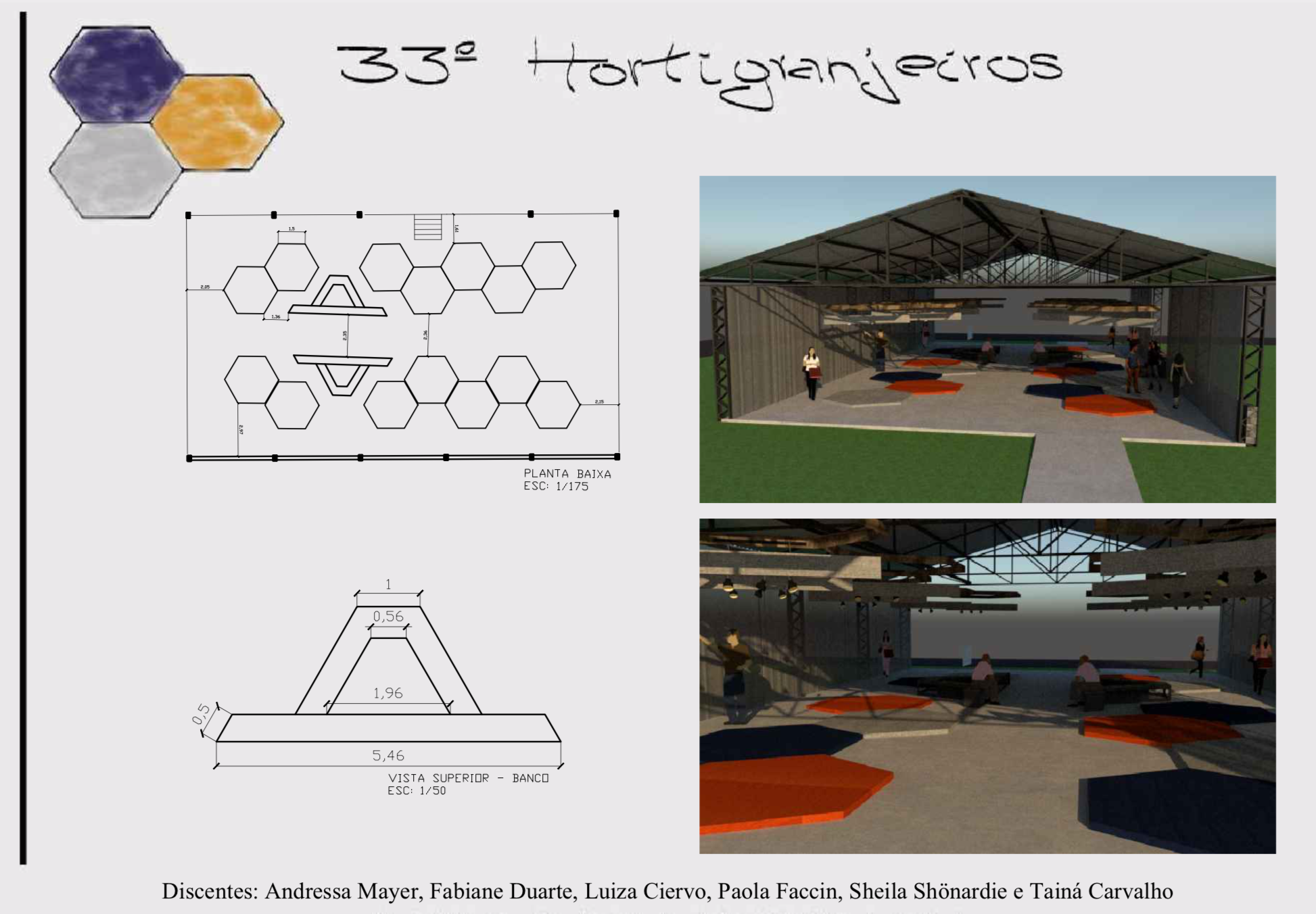 Na quarta-feira (18), alunos do curso de Arquitetura e Urbanismo reuniram-se com integrantes da comissão organizadora do 33º Encontro Estadual de Hortigranjeiros para apresentar as propostas de layout e interiores criadas para o ambiente do Pavilhão de Startups do evento. O encontro teve a participação da diretora-geral do IFFar – Campus Santa Rosa, Renata Rotta; da coordenadora do curso de Arquitetura e Urbanismo, Fernanda Conrad Rigo; do vice-presidente do 33º Encontro Estadual de Hortigranjeiros, Marcos Servat, acompanhado do coordenador-geral, Vanio Heimerdinger e da assessora de imprensa, Deise Froelich; além dos representantes dos grupos de acadêmicos que desenvolveram os projetos.