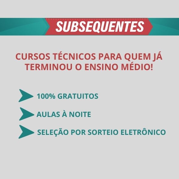 Cursos técnicos subsequentes: para quem já fez o Ensino Médio. Seleção por sorteio eletrônico.