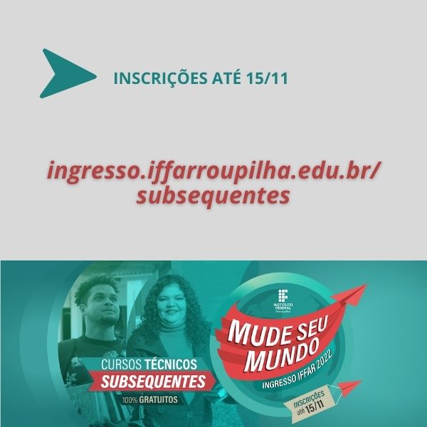 Cursos técnicos subsequentes são voltados para quem já tem Ensino Médio. A seleção é por sorteio eletrônico, sem necessidade de provas. As inscrições são gratuitas, assim como os cursos, e podem ser realizadas online até 15 de novembro, em ingresso.iffarroupilha.edu.br/subsequentes.
