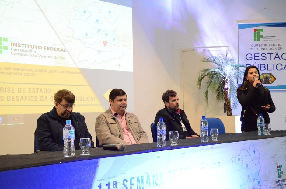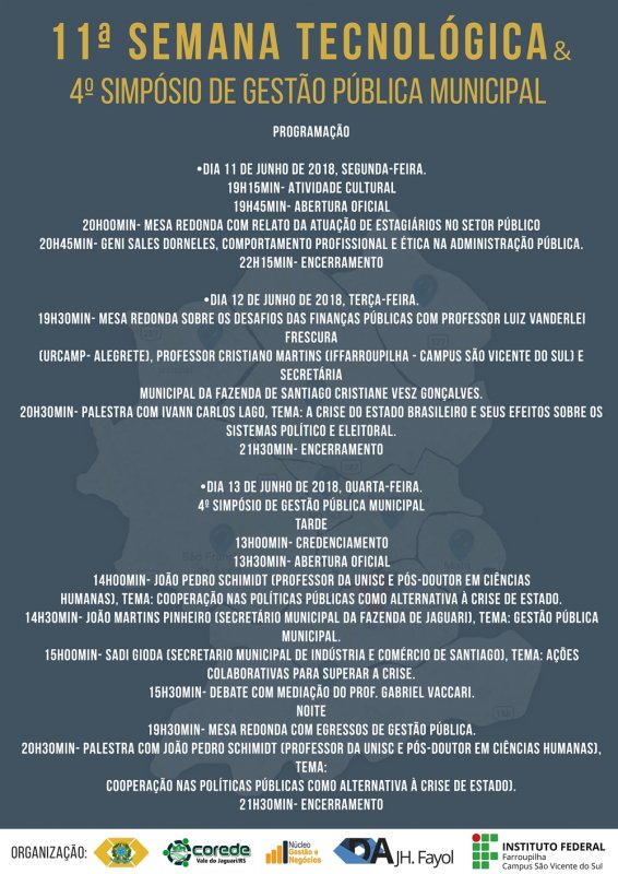 As turmas 10, 11 e 12 do Curso de Tecnologia em Gestão Pública do Instituto Federal Farroupilha - Campus São Vicente do Sul promovem mais uma edição da semana acadêmica, evento que propõe o diálogo e a troca de experiências entre estudantes da área, atores sociais das diversas comunidades do Corede Vale do Jaguari e executivos municipais.