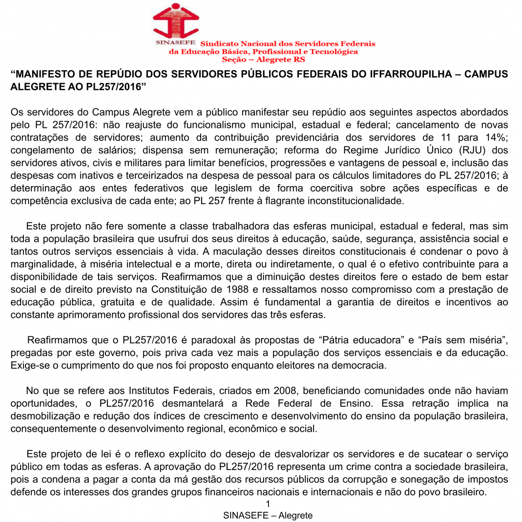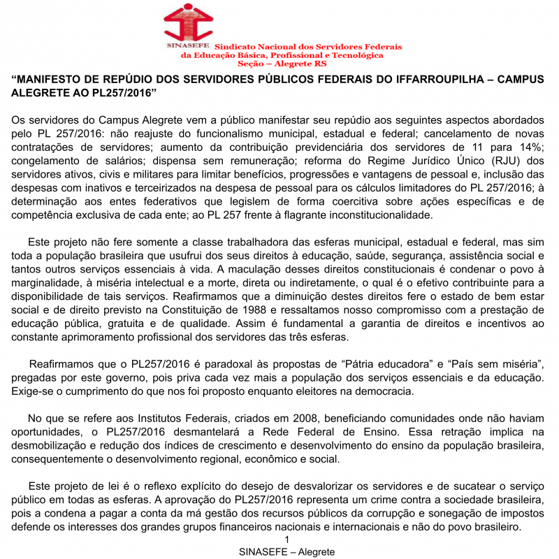No dia de ontem, 14, em apoio à paralisação nacional em repúdio ao PLC 257/2016, os servidores do IF Farroupilha Campus Alegrete também pararam suas atividades. O Campus não teve expediente durante os três turnos, porém durante o período da manhã, os servidores se uniram para elaborar uma carta aberta, a ser enviada ao Governo Federal, em repúdio ao PLC 257/2016. Diversos servidores estiveram presentes na ação e contribuiram na elaboração deste documento: