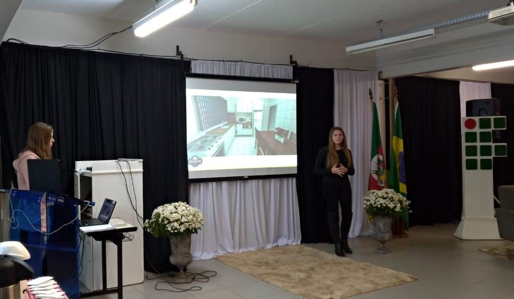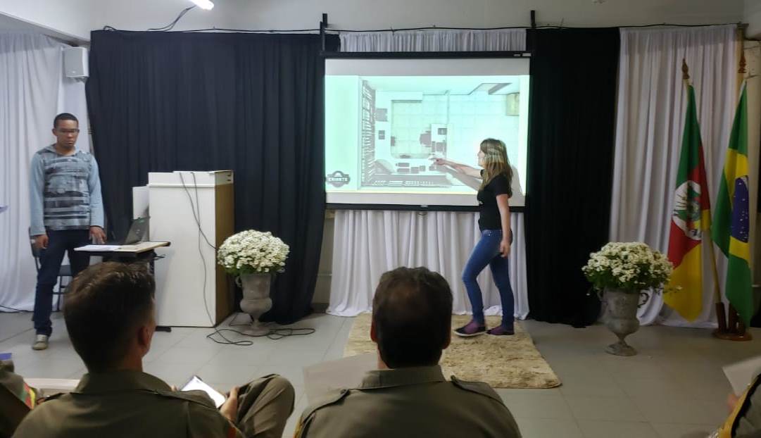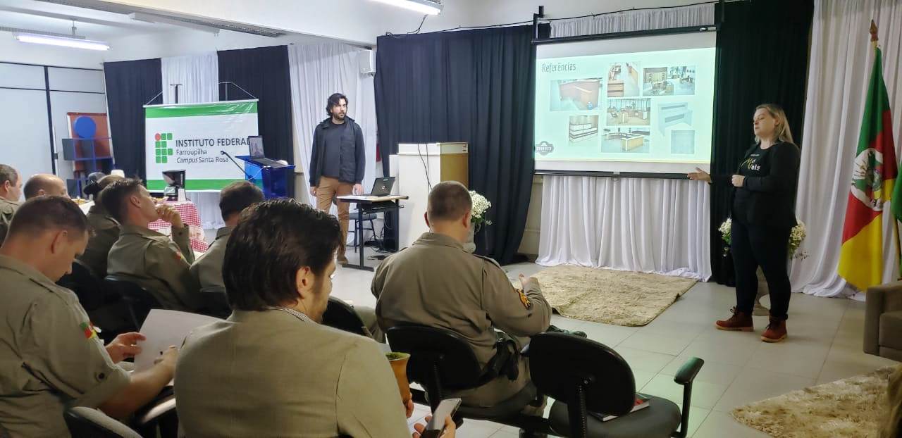 Na quinta-feira (12), representantes do 1º Batalhão Rodoviário da Brigada Militar de Santa Rosa estiveram no auditório do Campus para a apresentação dos projetos. Ao todo, foram apresentados 3 layouts para a recepção do local e 2 para a cozinha. Após ouvir os argumentos dos clientes, e tendo a aprovação das propostas apresentadas, o próximo passo será a produção dos mobiliários no Laboratório de Móveis. Até o final do ano letivo, todo o processo será materializado. O material base que será utilizado para a confecção do mobiliário foi disponibilizado pela própria Polícia Rodoviária.
