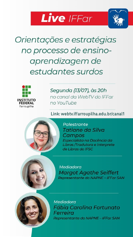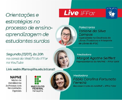 A palestrante será Tatiane da Silva Campos - Especialista na Docência da LIBRAS/Tradutora e Intérprete de LIBRAS (IFSC), e mediada por Margot Seifert e Fábia Ferreira - Representantes do NAPNE (IFFar SAN).
