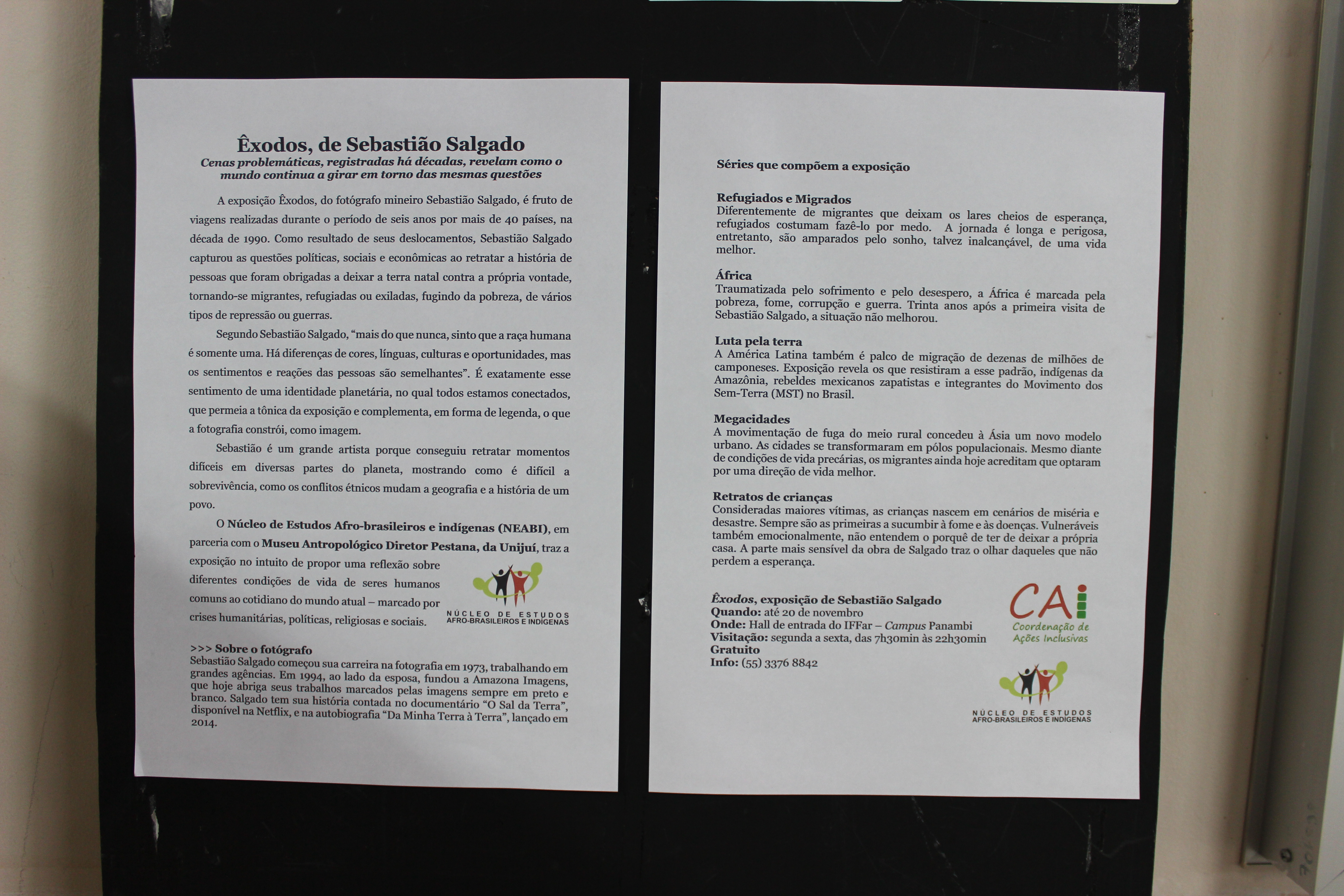 A exposição Êxodos, do fotógrafo mineiro Sebastião Salgado, é fruto de viagens realizadas durante o período de seis anos por mais de 40 países, na década de 1990. Como resultado de seus deslocamentos, Sebastião Salgado capturou as questões políticas, sociais e econômicas ao retratar a história de pessoas que foram obrigadas a deixar a terra natal contra a própria vontade, tornando-se migrantes, refugiadas ou exiladas, fugindo da pobreza, de vários tipos de repressão ou guerras.