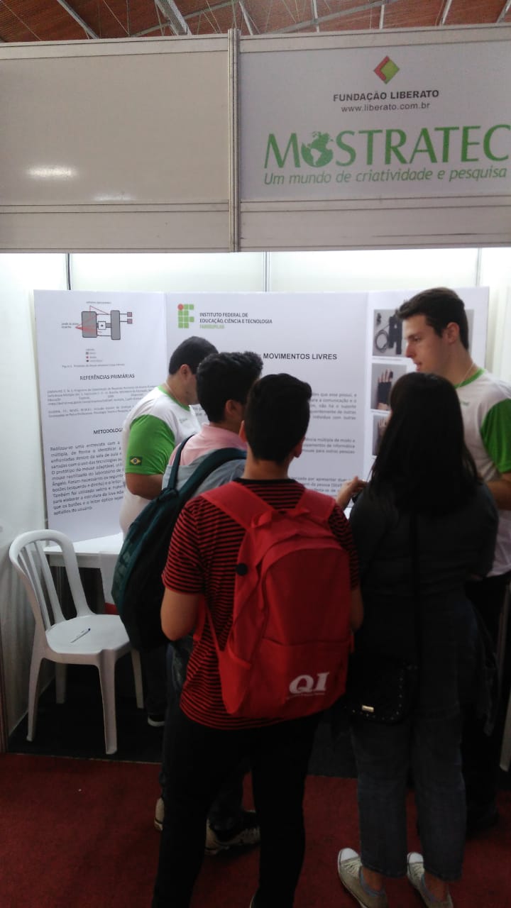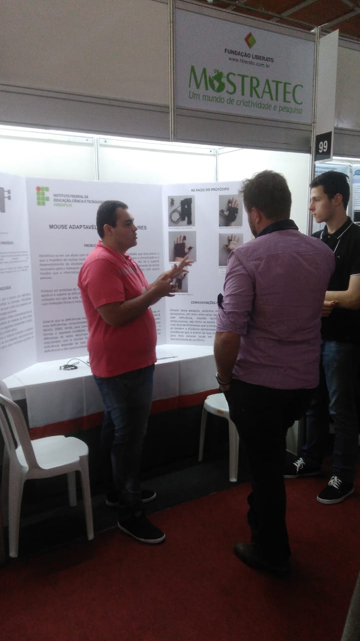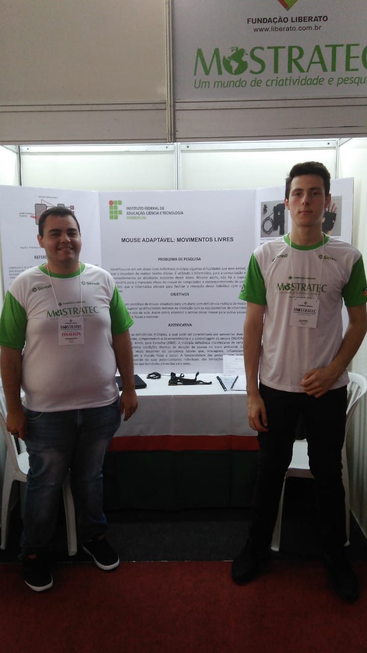 Entre os dias 22 e 26 de outubro, os alunos Lucas Carnelutti e Varlei da Rosa, respectivamente do 2º e 3º ano do Curso Técnico em Manutenção e Suporte em Informática - Integrado, participaram e conquistaram o 4º lugar na Mostra Internacional de Ciência e Tecnologia (MOSTRATEC) 2018, na categoria Ciência da Computação, com o trabalho "Mouse adaptável: movimentos livres". O trabalho foi coordenado pelo professor Vlads Barcelos Godoi e abordou o tema de Tecnologia Assistiva visando a acessibilidade e Inclusão Digital de pessoas com deficiência.