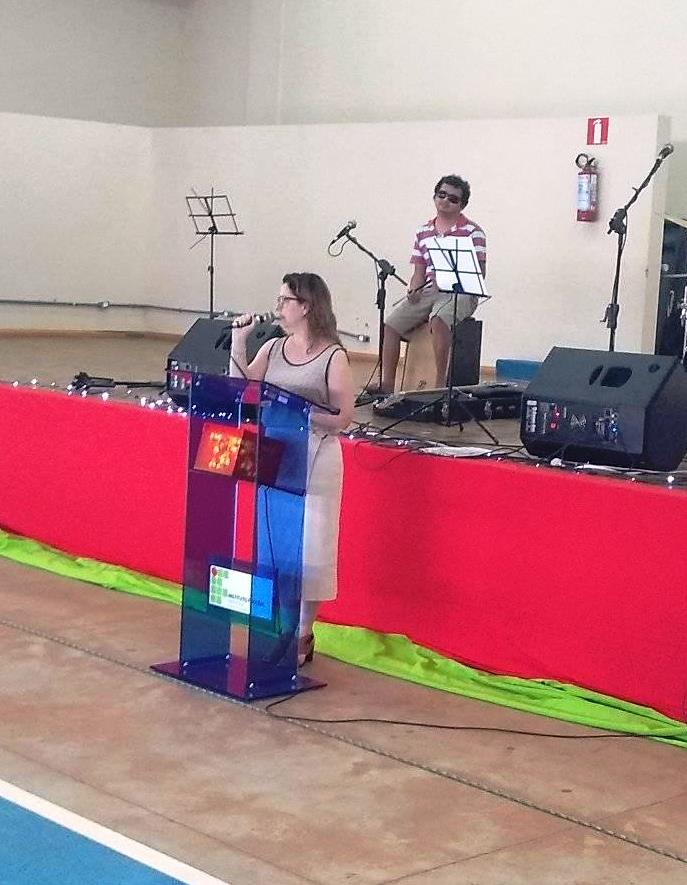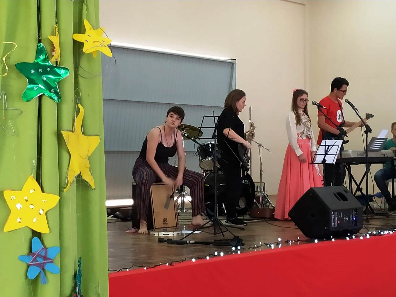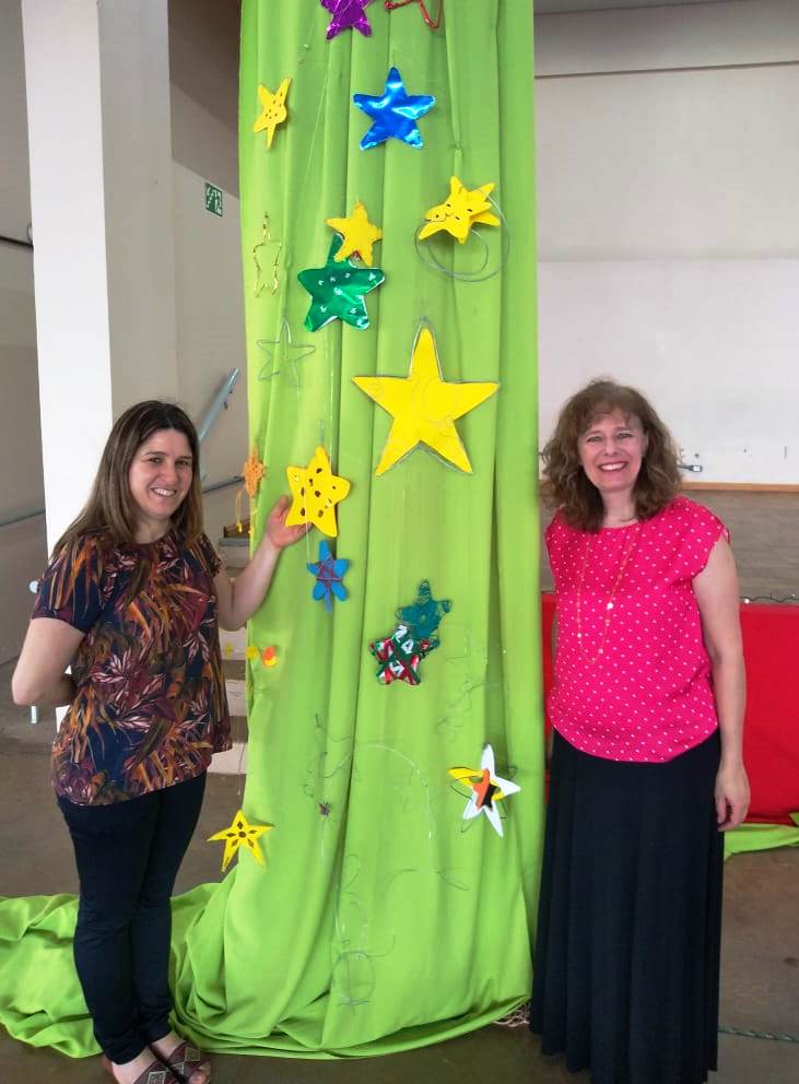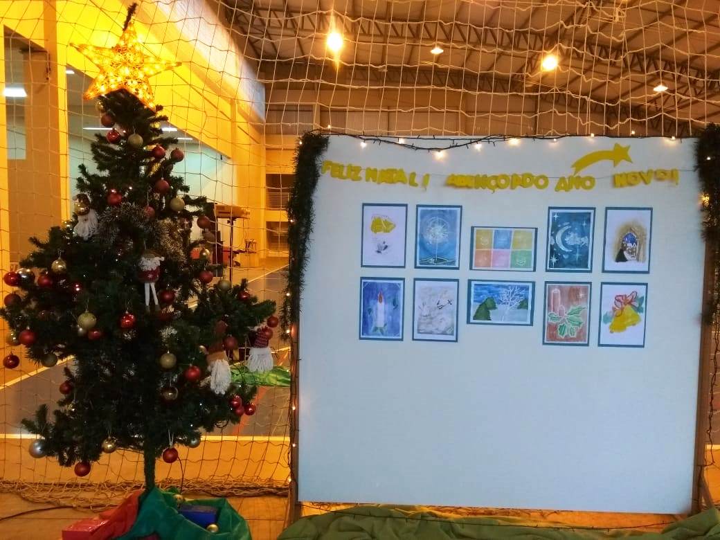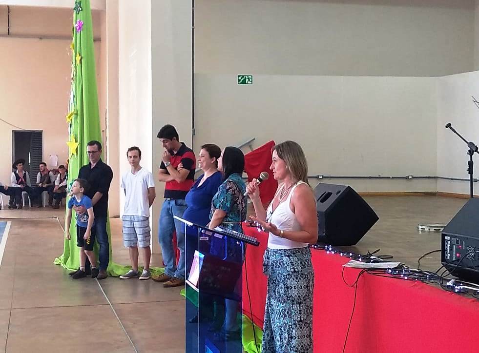A professora Cornelia Kudiess falou sobre o significado e os símbolos do Natal. Questionando “qual será a sua e a nossa história?”, a professora convidou a comunidade a refletir sobre o que é realmente significativo, destacando o dom divino que pulsa, em diversas formas, em cada coração. Os alunos do 1º ano dos cursos Técnicos Integrados em Edificações e Móveis confeccionaram várias estrelas que foram usadas na decoração do ginásio. “Assim como as estrelas que decoram nossa árvore hoje, cada um de nós é único e tem uma história para viver e contar”, disse a professora.