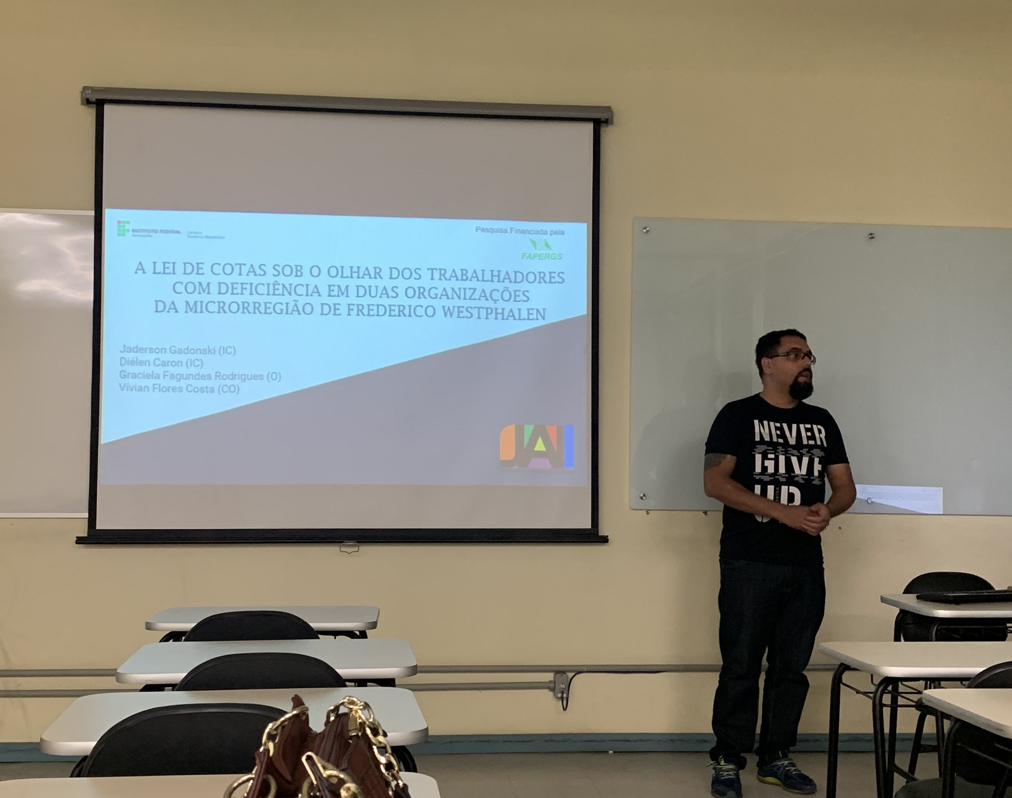 - A Lei de Cotas sob o olhar dos trabalhadores com deficiência em duas organizações da microrregião de Frederico Westphalen. (Trabalho derivado do projeto de pesquisa “Inclusão nas empresas da Microrregião de Frederico Westphalen: perspectivas da pessoa com deficiência e da Gestão de Pessoas”). Acadêmico: Jaderson Gadonski.