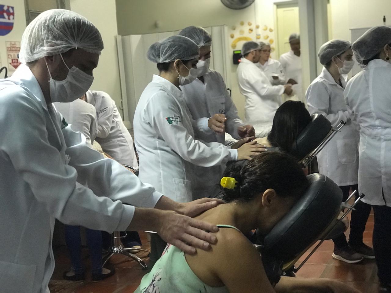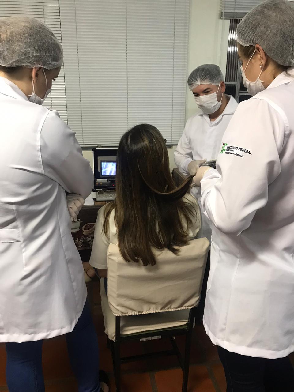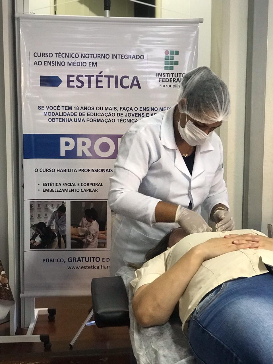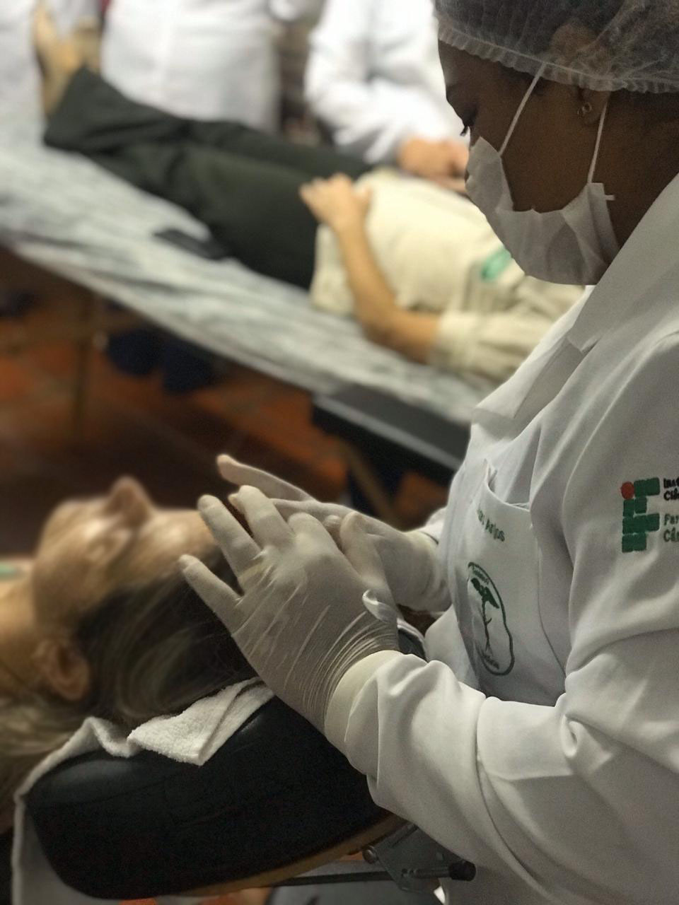 Nesta oportunidade foram realizados 65 atendimentos, onde os estudantes do Curso Técnico em Estética Proeja realizaram a prática de quick massagem e higienização e hidratação facial e os estudantes do Superior de Estética e Cosmética, design de sobrancelhas e avaliação capilar com tricoscopia.