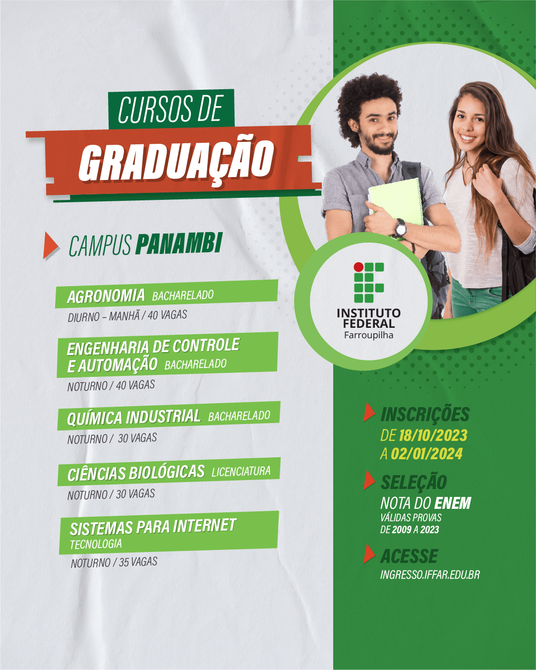 As inscrições para o Processo Seletivo dos Cursos de Graduação do IFFar vão até 2 de janeiro de 2024. No Campus Panambi são ofertadas 175 vagas em cinco diferentes cursos: Agronomia (novo); Engenharia de Controle e Automação (novo); Química Industrial (novo); Licenciatura em Ciências Biológicas e Tecnologia em Sistemas para Internet.