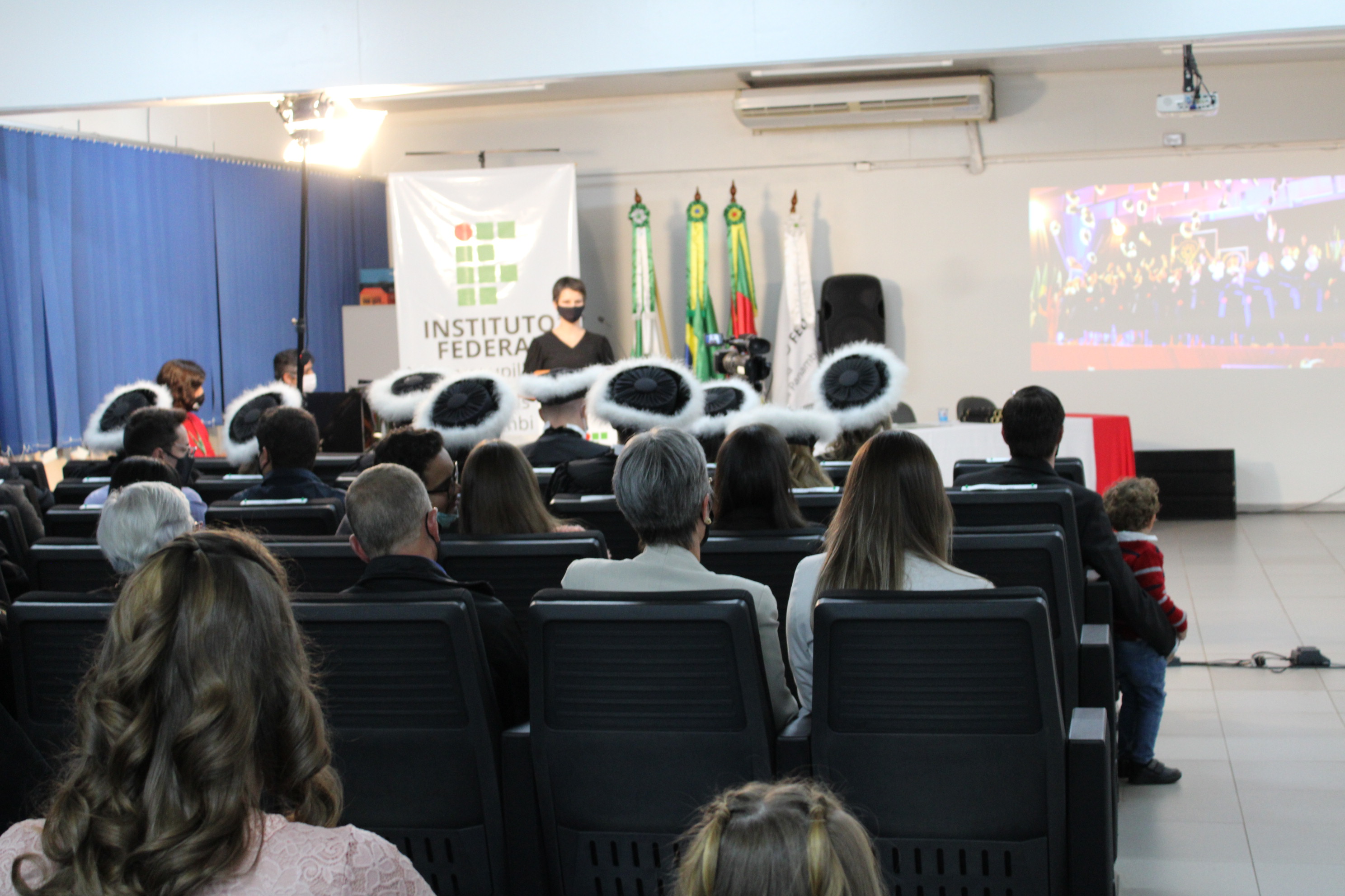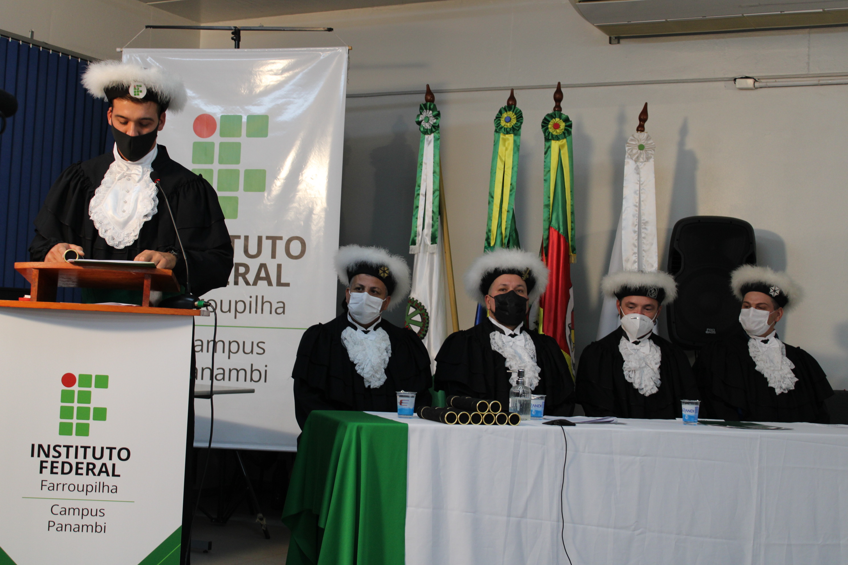 Na noite de sexta-feira, 1º/04, a comunidade acadêmica do Instituto Federal Farroupilha – Campus Panambi esteve em festa. Realizou-se, no auditório do Campus, a solenidade de outorga de grau a 26 concluintes dos Cursos de Licenciatura em Ciências Biológicas, Licenciatura em Química, Tecnologia em Produção de Grãos e Tecnologia em Sistemas para Internet. Cinco concluintes participaram da solenidade de forma remota, inaugurando o modelo híbrido de Colações de Grau no Campus.