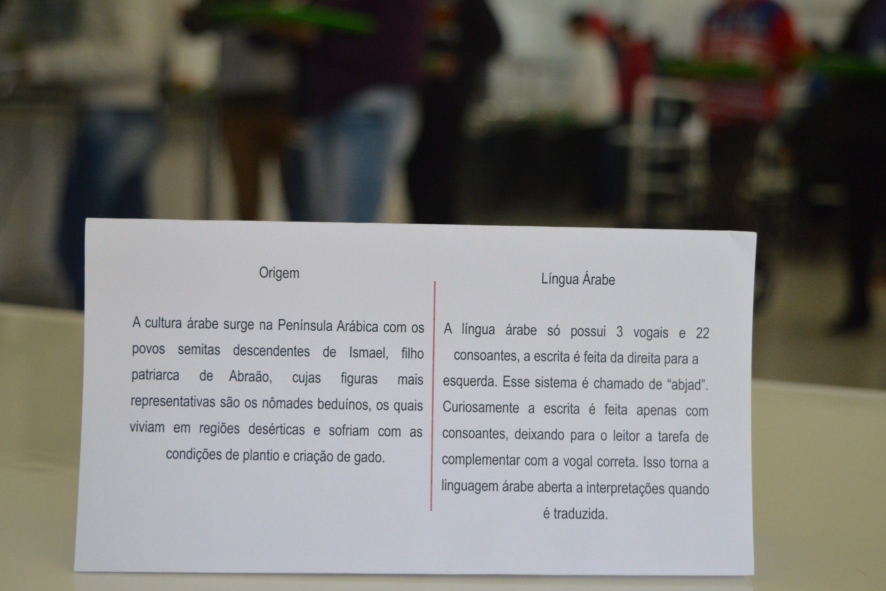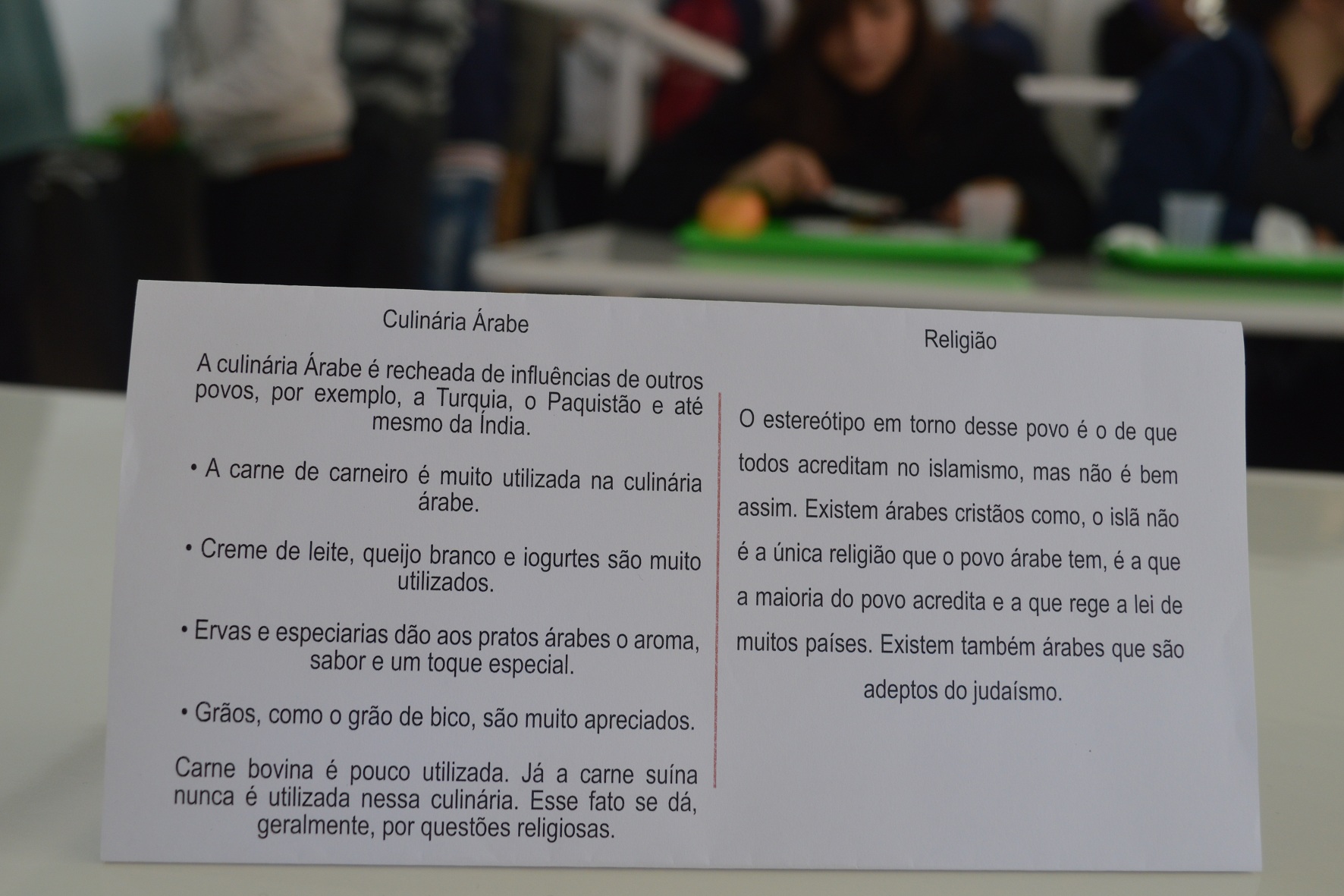 Cultura Árabe foi escolhida para a primeira edição. Quibe foi o prático típico da culinária árabe apresentado aos alunos.