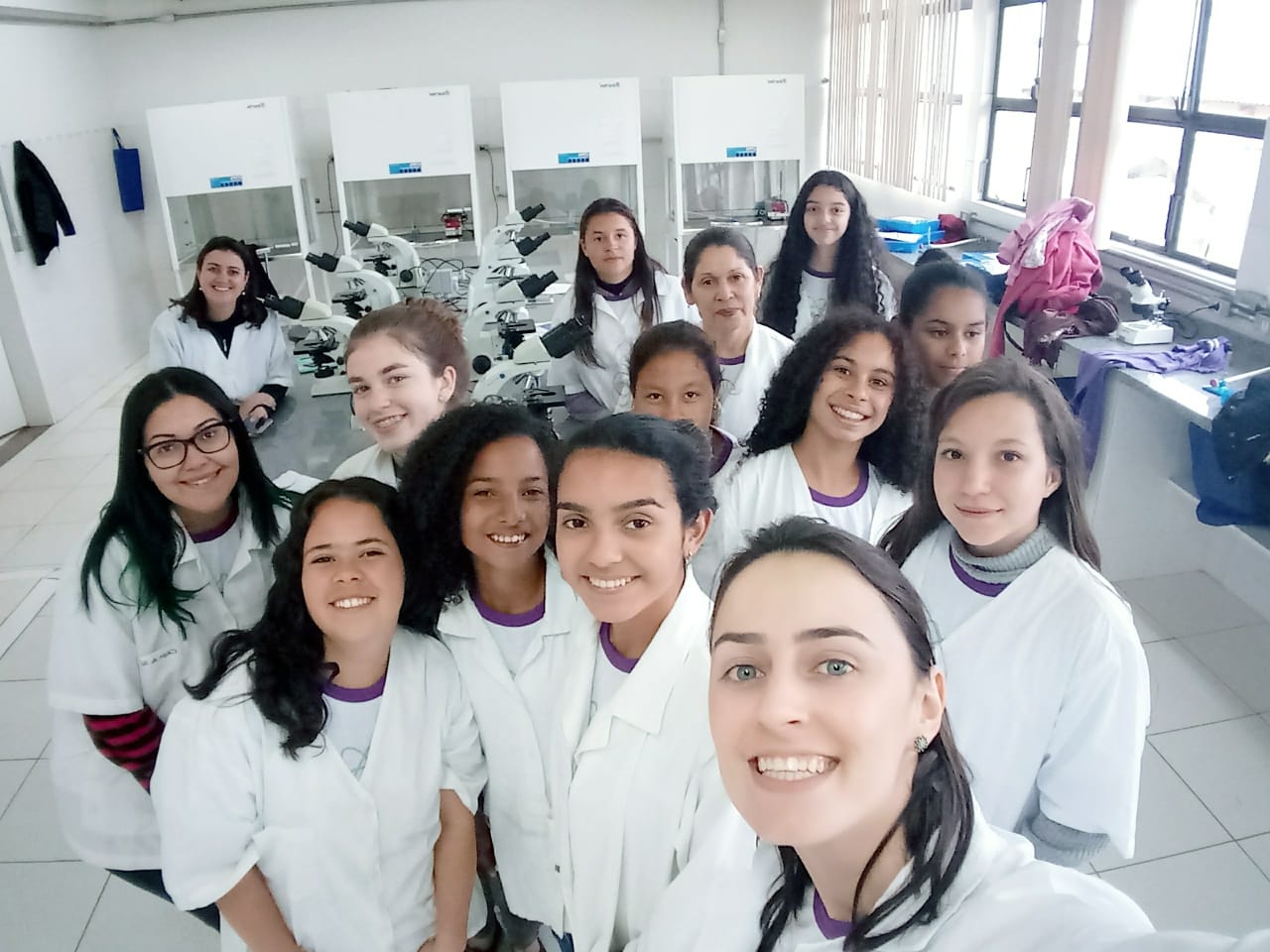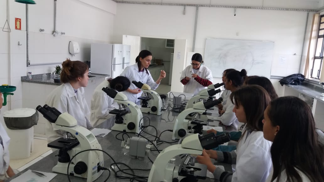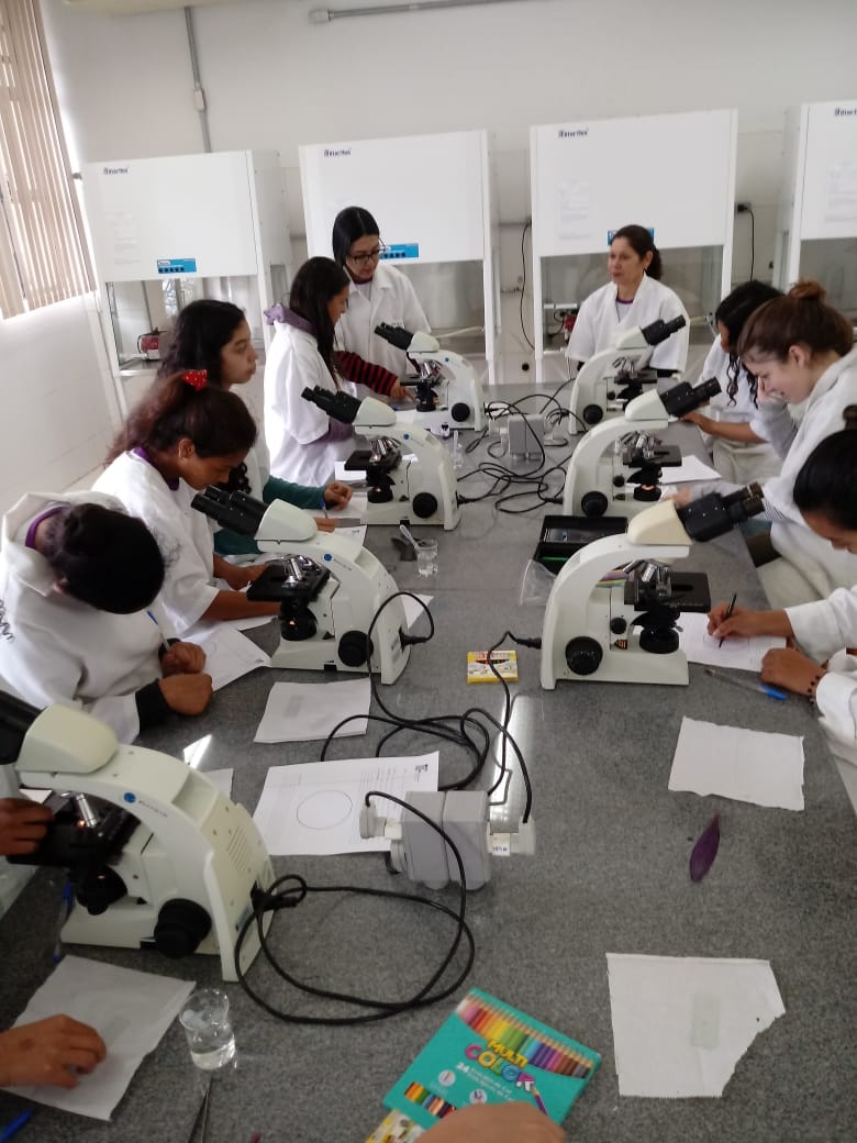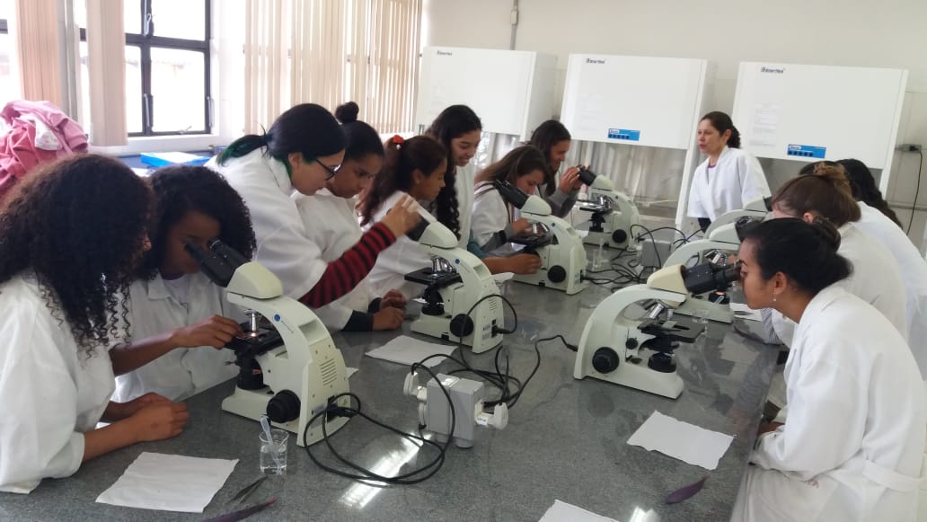 Nesse primeiro encontro, houve uma dinâmica inicial, abordando a temática do papel da mulher na sociedade e de sua representatividade na ciência e tecnologia e, posteriormente, uma prática no Laboratório de Microbiologia, onde as alunas tiveram contato com a microscopia através da preparação de lâminas a fresco, para a observação de tecido epitelial vegetal e células que formam esse tecido e também a visualização da anatomia de artrópodes.