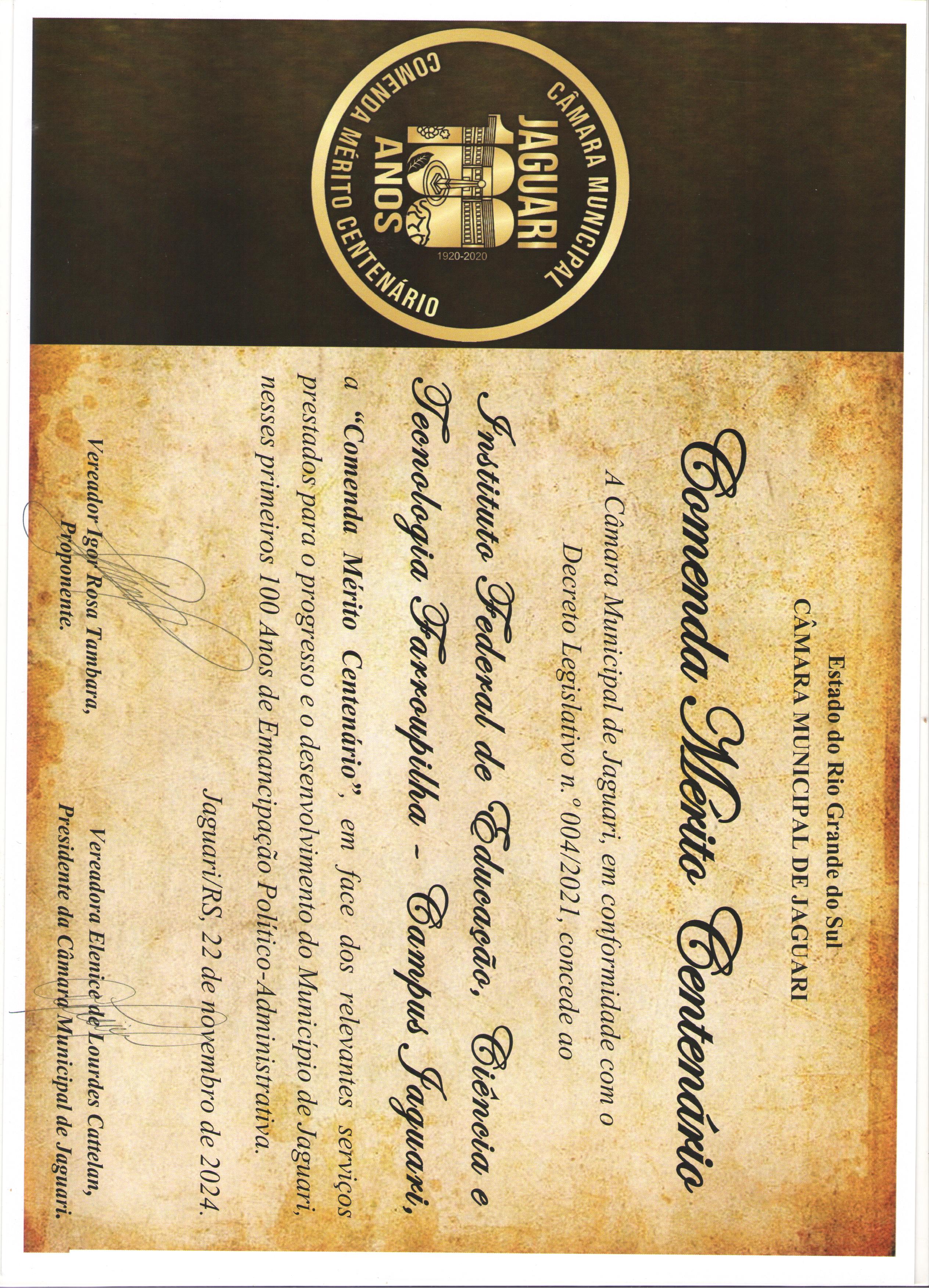 No dia 22 de novembro de 2024, em sessão solene realizada no Clube União, o legislativo municipal de Jaguari, RS, por indicação do vereador Igor Rosa Tambara, concedeu ao IFFAR Campus Jaguari a Comenda Mérito Centenário, “em face dos relevantes serviços prestados para o progresso e o desenvolvimento do Município de Jaguari, nesses primeiros 100 anos de Emancipação Político-administrativa”. Em nome de todos os nossos servidores e estudantes, agradecemos esse destaque e reconhecimento. Muito obrigado ao Legislativo municipal de Jaguari, em especial, ao vereador Igor Rosa Tambara pela indicação de nossa instituição para essa honrosa homenagem.