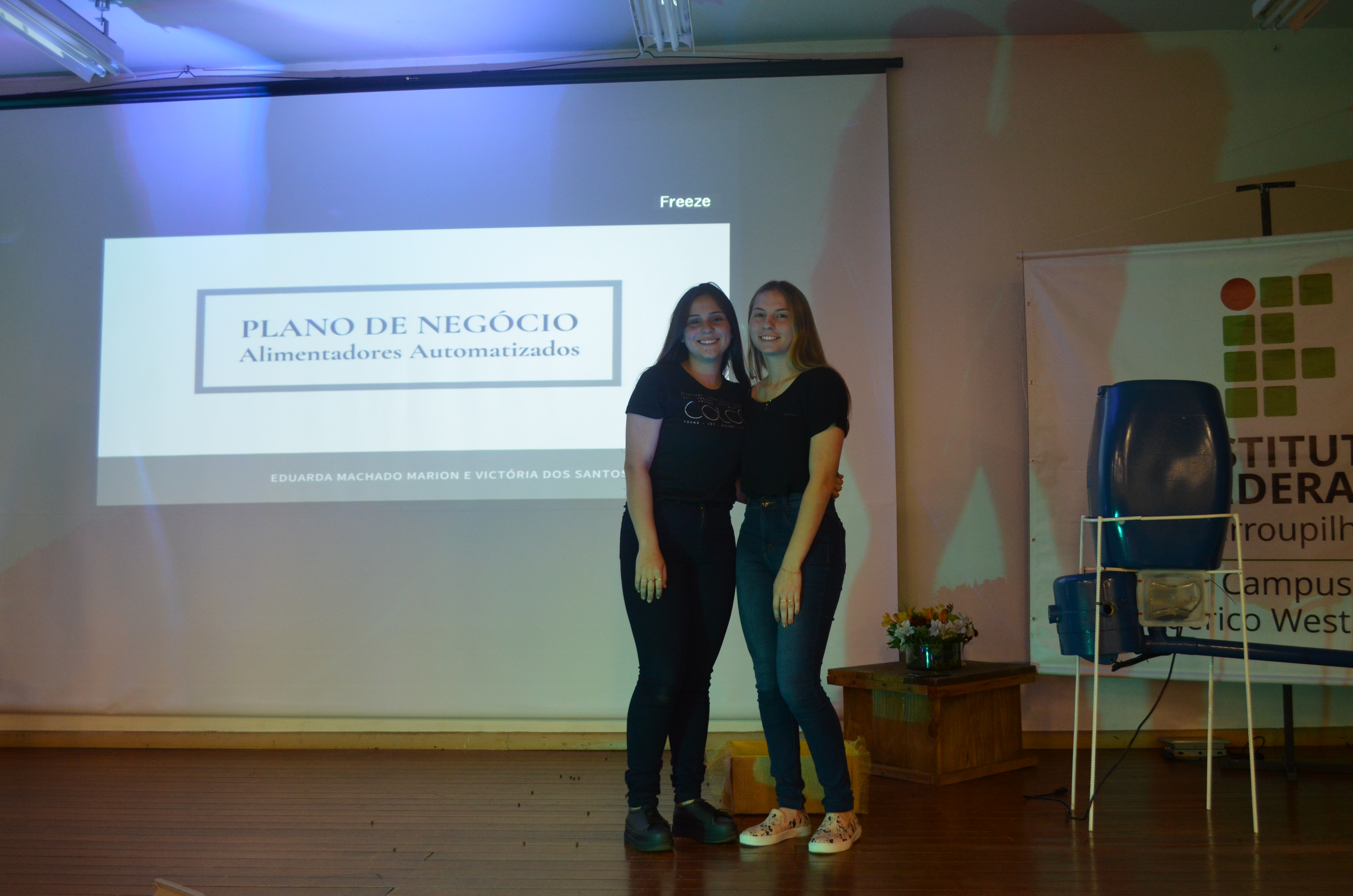 1º Lugar: Equipe “Alimentadores Automatizados para Peixes”, apresentada por Eduarda Marion e Victória dos Santos Turchetto.