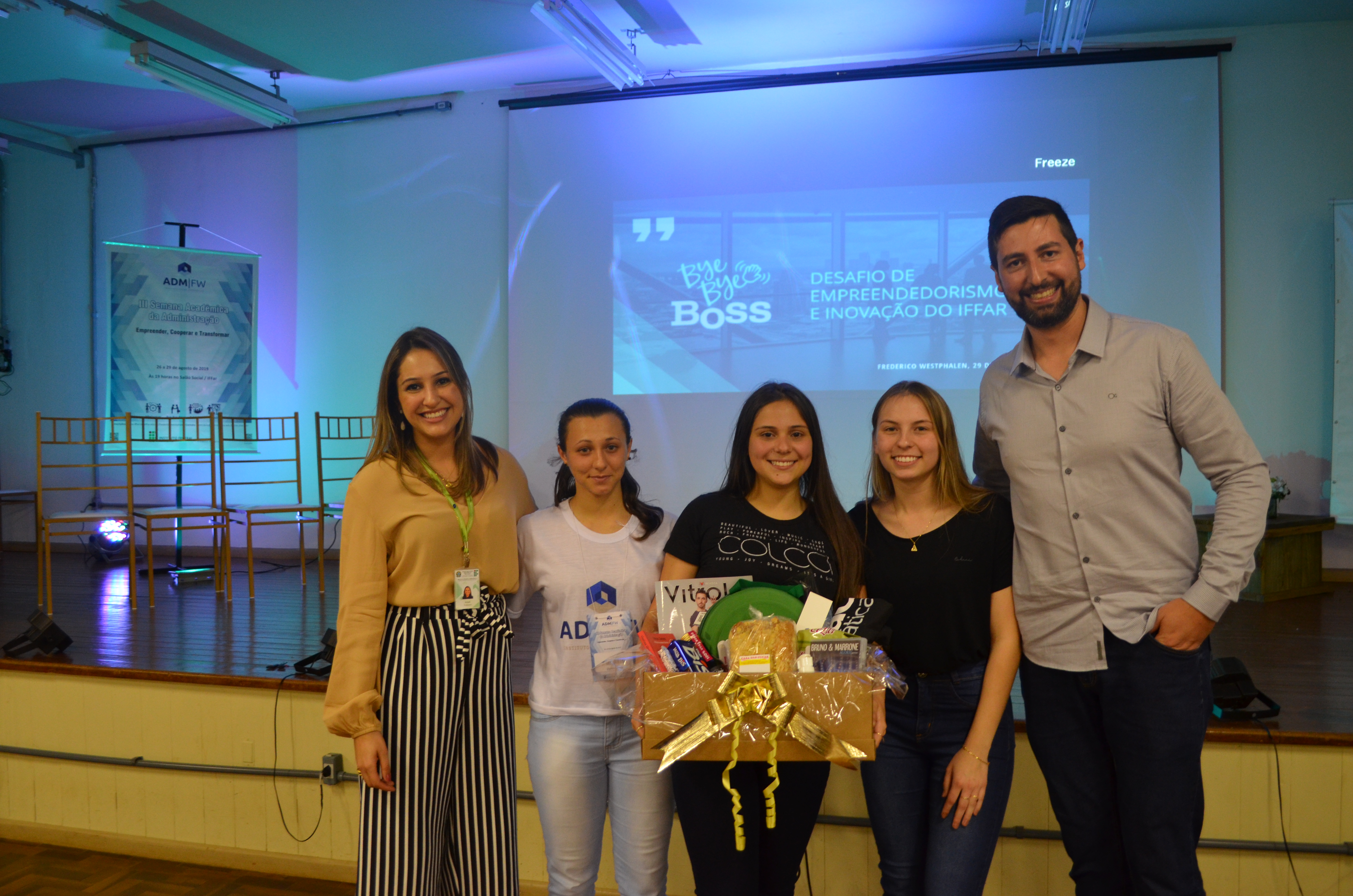 A III Semana Acadêmica da Administração sediou neste ano o Desafio de Empreendedorismo e Inovação do IFFar - Bye Bye Boss, o desafio recebeu como membros jurados da banca avaliadora, o CEO e Fundador da Ramos e Copini Autopeças - Flávio Ramos, a Secretária da Fazenda e membra do Comitê de Governança de Frederico Westphalen – Simone Duarte da Silva e a Sócia Administradora da Tchêturbo de Frederico Westphalen e da BRPhonia de Santa Rosa, Sonia Cenedese Bastian.