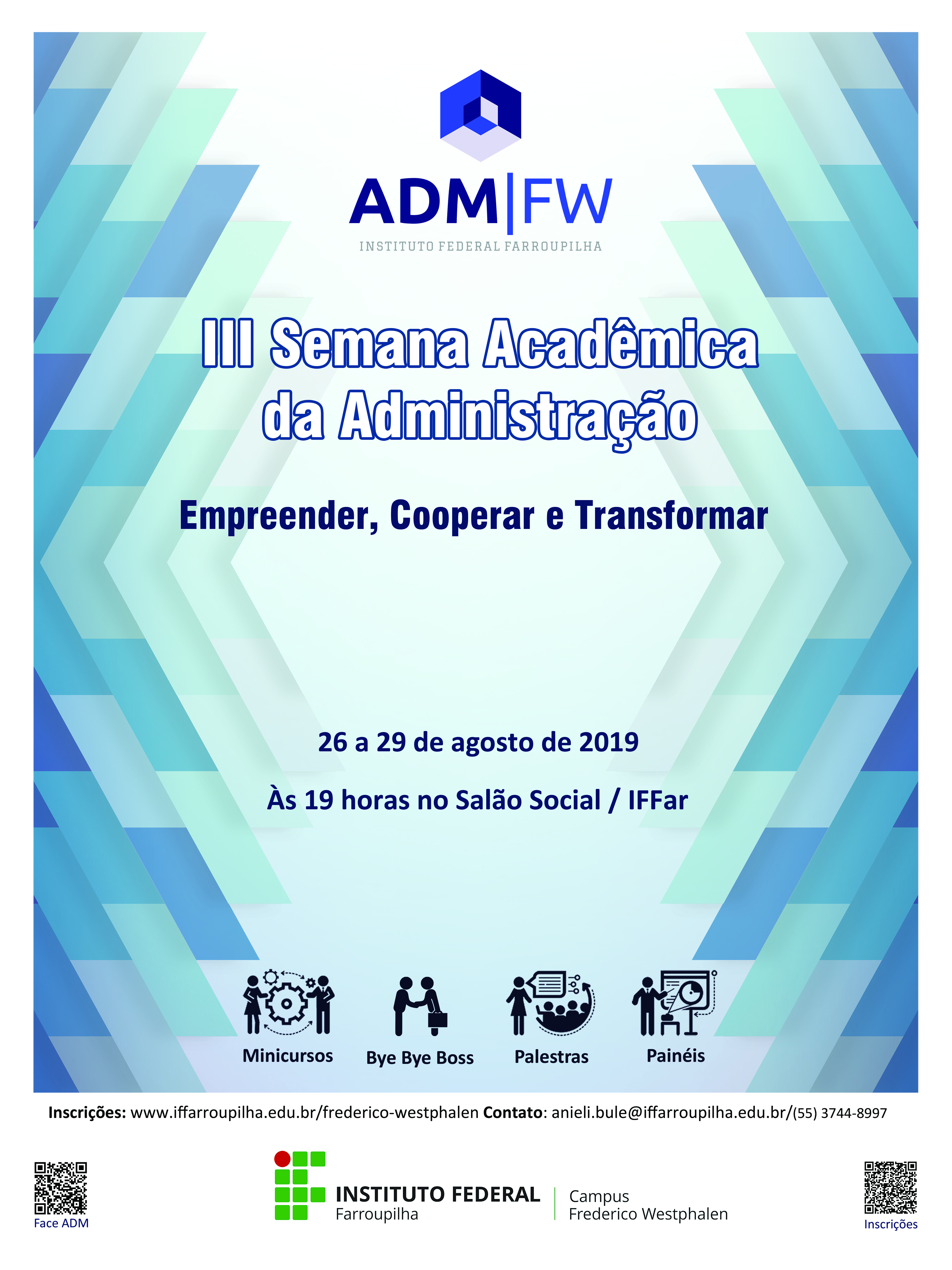 A Semana Acadêmica da Administração é uma realização do Curso de Administração do Instituto Federal de Educação, Ciência e Tecnologia Farroupilha - Campus Frederico Westphalen. Neste ano, o evento tem como Eixo Temático – Empreender, Cooperar e Transformar. O evento acadêmico pretende reunir estudantes, pesquisadores, empresários, administradores e profissionais de diferentes áreas.