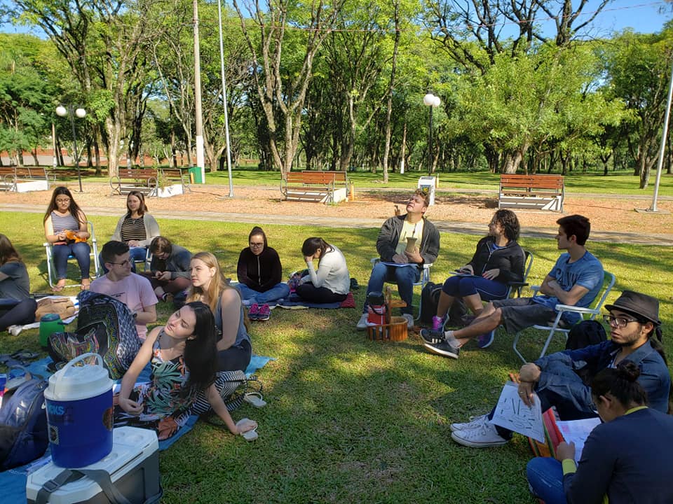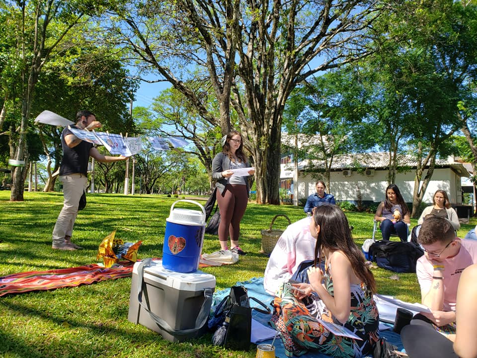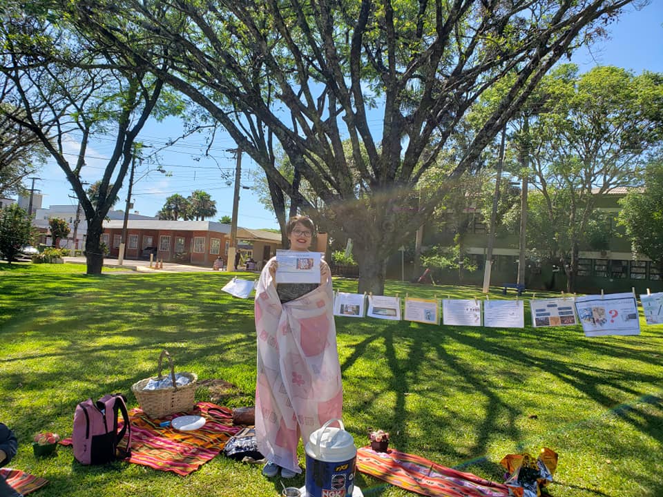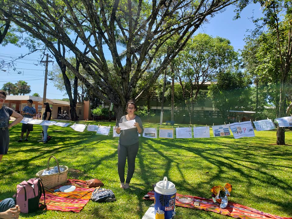 Durante o piquenique, os licenciandos apresentaram, individualmente, os estudos que fizeram sobre o livro "Documento de Identidade", de Tomaz Tadeu da Silva. A partir da apresentação dos trabalhos, os alunos construíram um varal de ideias e conceitos. Em clima de integração, a atividade foi marcada pela descontração, diálogos, música e brincadeiras. O varal de ideias ficará exposto no corredor do Prédio Pedagógico 1, a partir da próxima semana.