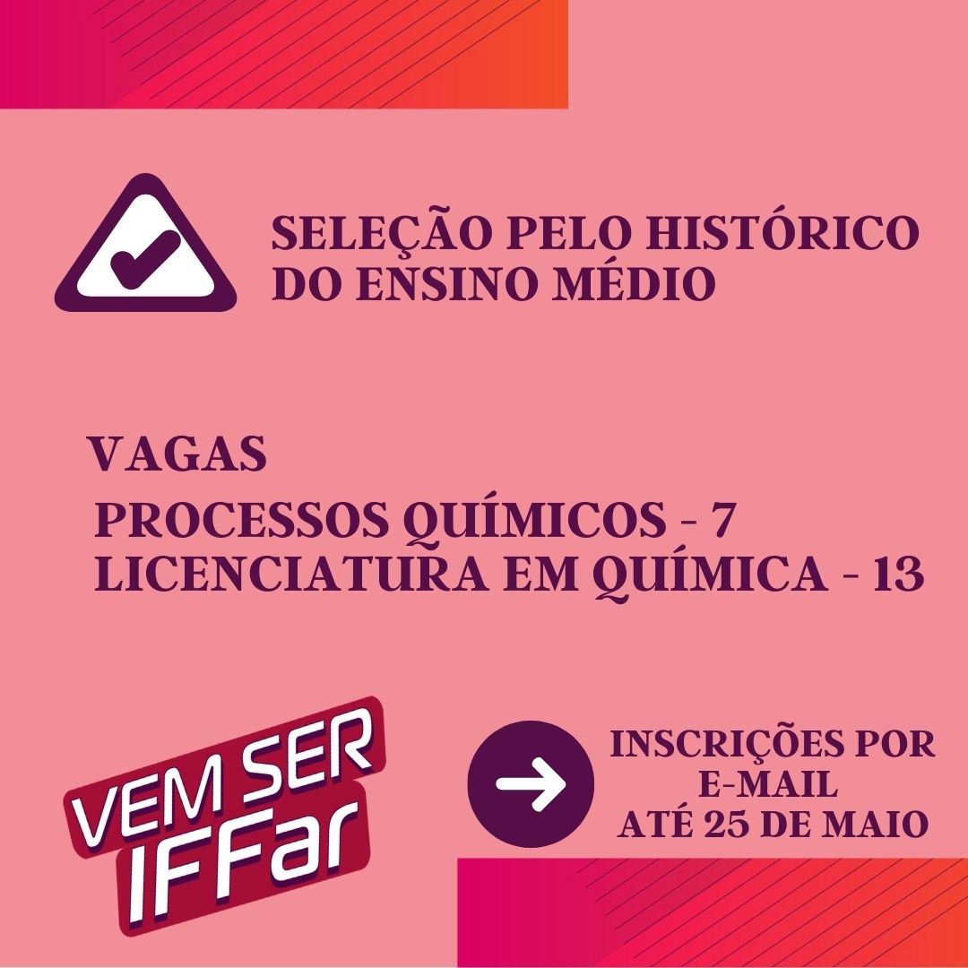 Inscrições abertas do Processo Seletivo Complementar para o preenchimento de vagas remanescentes dos Cursos Superiores de Graduação do IFFar – Campus Panambi. São 7 vagas para Processos Químicos e 13 vagas para Licenciatura em Química.