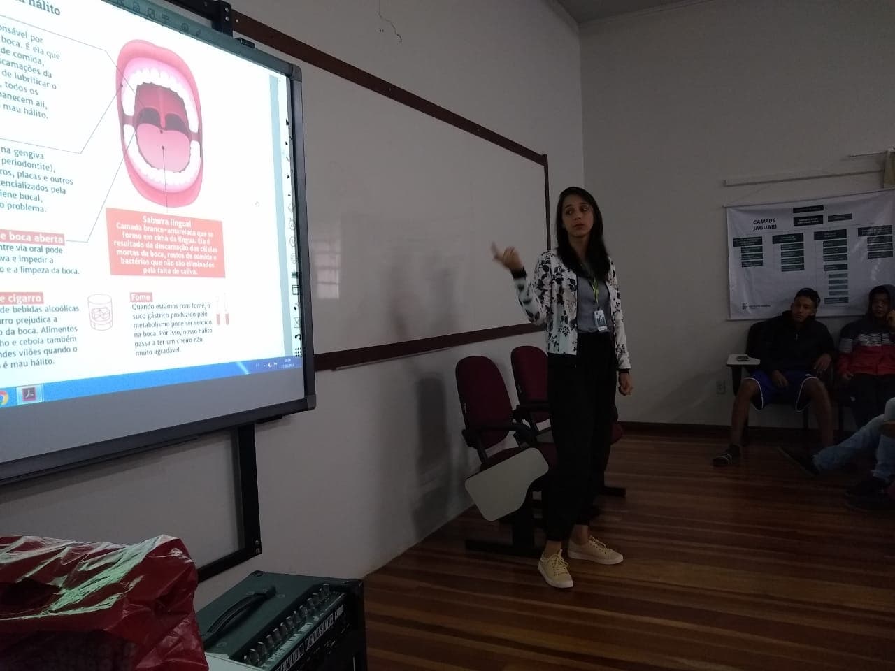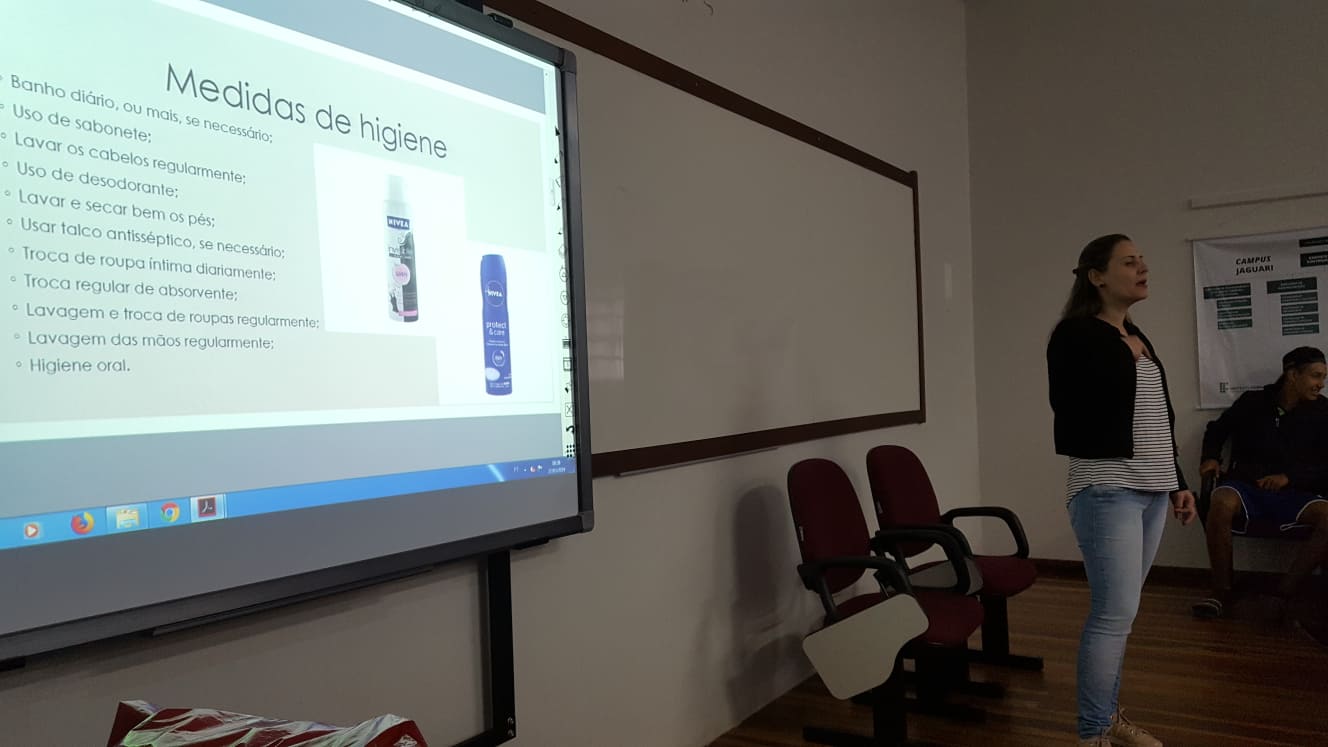 Na última quarta-feira de março, 27, a enfermeira e a odontóloga do campus Jaguari conversaram com os discentes dos primeiros anos dos Cursos Técnicos Integrados sobre hábitos de higiene. Na ocasião, foi ressaltada a importância da manutenção da limpeza dos ambientes e do cuidado com a higiene pessoal, principalmente se tratando de ambientes coletivos e espaços de convivência.