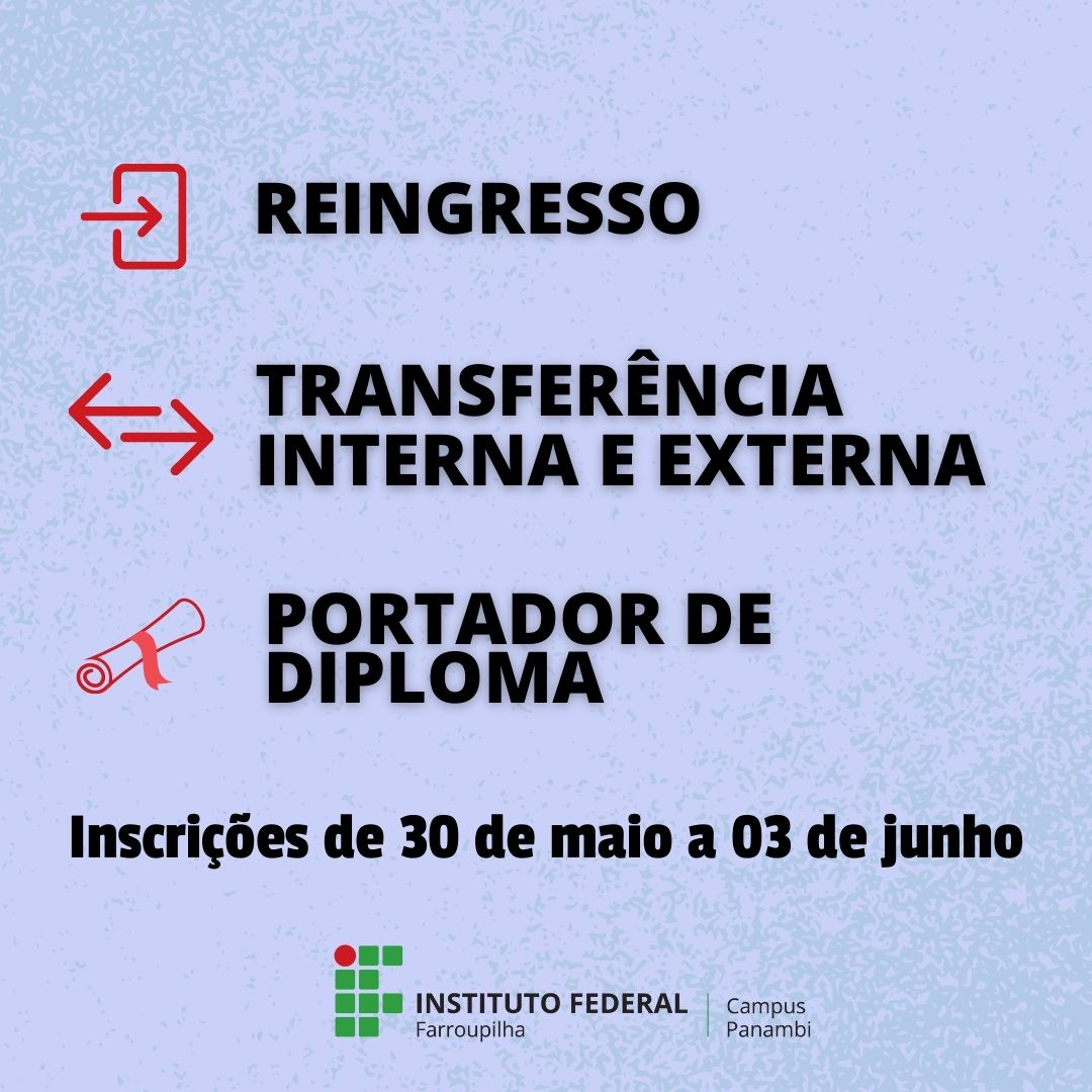 Reingresso: para ex-estudantes do IFFar que queiram retomar o vínculo de matrícula no mesmo curso, nível e modalidade de ensino anterior;