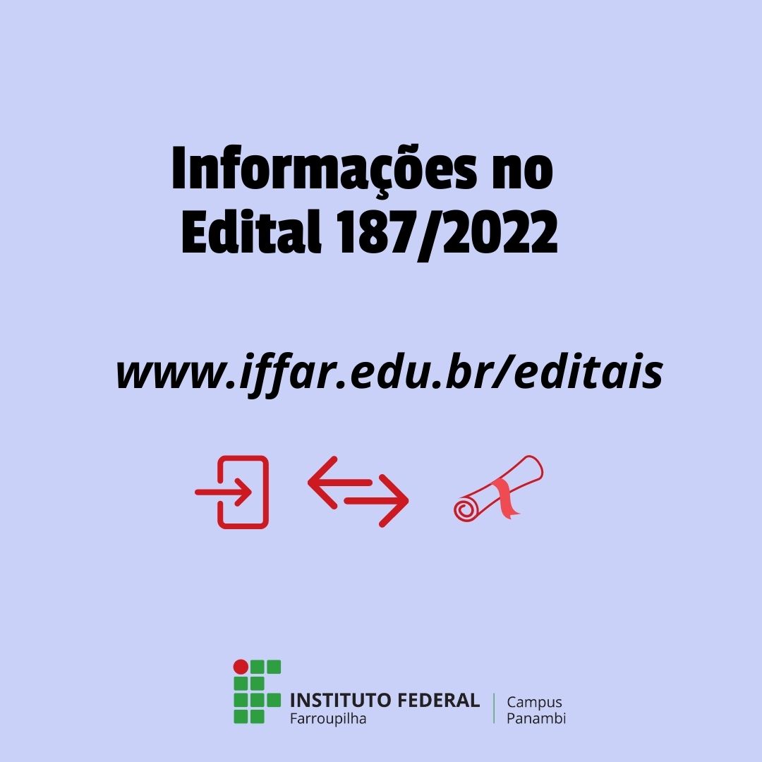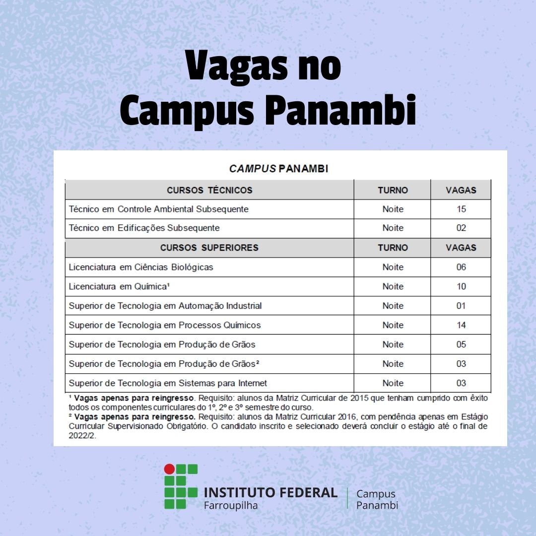 São ofertadas vagas em diversos cursos do Campus Panambi. Para mais informações consulte o Edital 187/2022 disponível em www.iffar.edu.br/editais.