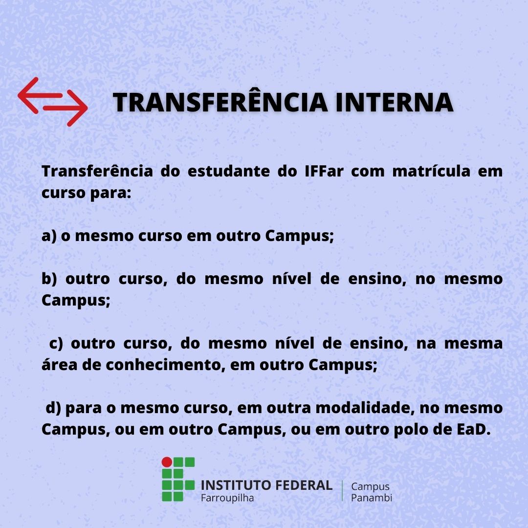 Transferência interna: tratam da transferência do estudante do IFFar com matrícula em curso para: a) o mesmo curso em outro campus; b) outro curso, do mesmo nível de ensino, no mesmo campus; c) outro curso, do mesmo nível de ensino, na mesma área de conhecimento, em outro campus; d) para o mesmo curso, em outra modalidade, no mesmo campus ou em outro campus ou em outro polo de EaD.